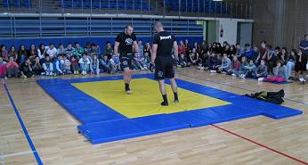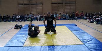 Demonstracija je održana na malom prilagođenom borilištu u školskoj dvorani, a učenici i učitelji su s pozornošću pratili ovu malu „ sportsku priredbu“.