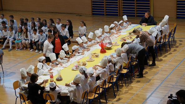 Ništa manje nisu bili marljivi niti učenici prvih razreda, koji su, vrlo hrabro i samouvjereno ,mijesili svoja prva peciva i male kruščiće, na pozornici naše dvorane. Oni su bili dio svečane školske priredbe koju su priredili učenici nižih razreda, zajedno sa svojim učiteljicama. Sve su to iz gledališta budno pratile oči ponosnih roditelja, baka, djedova...