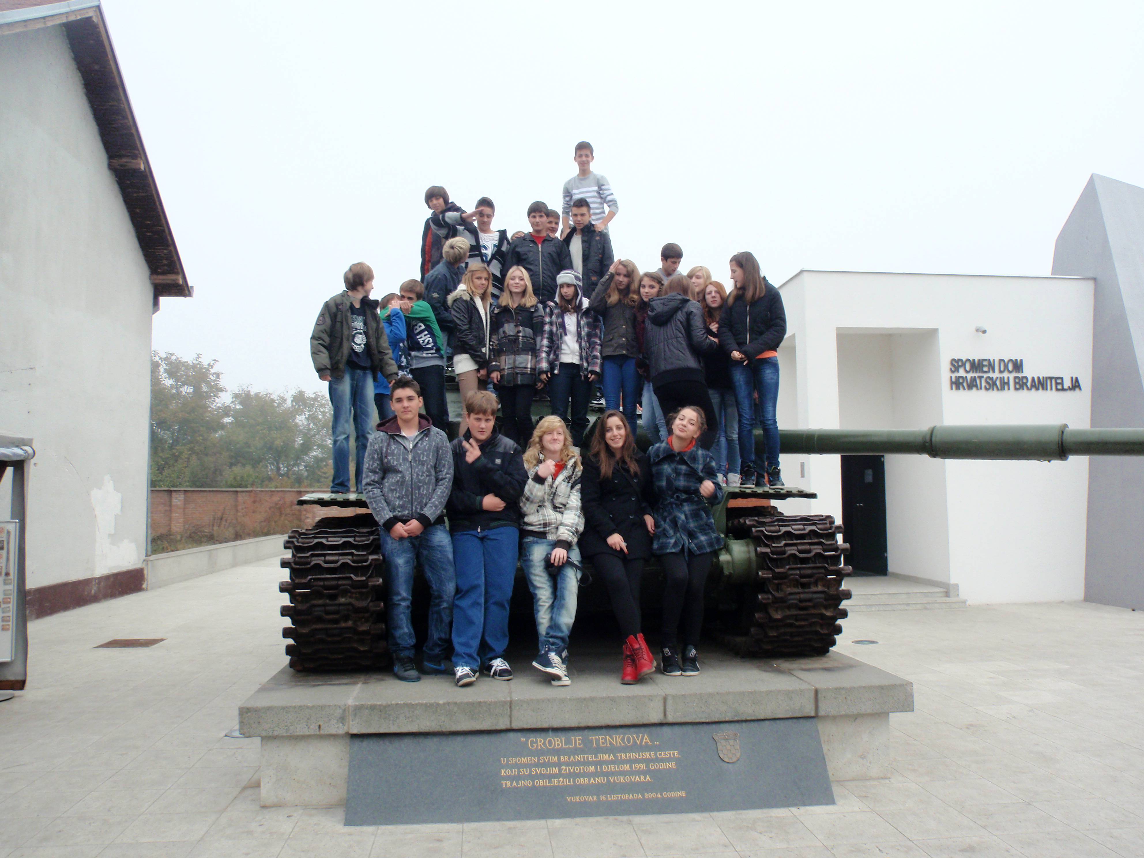 Prvo smo posjetili Trpinjsku cestu gdje se nalazi tzv. "groblje tenkova“ i Spomen dom hrvatskih branitelja . Na podu tog muzeja su se mogle vidjeti mnoge pločice s brojkama koje simboliziraju tenkove. Tamo je također bilo izloženo i oružje, a na zidu velikim slovima napisana imena i prezimena ljudi koji su uništavajući tenkove ovdje ostavili svoje živote. Prije nego što smo krenuli dalje, fotografirali smo se na tenku koji se nalazi ispred spomen doma. Nakon kratke vožnje autobusom stigli smo i pred Vukovarsku bolnicu.
