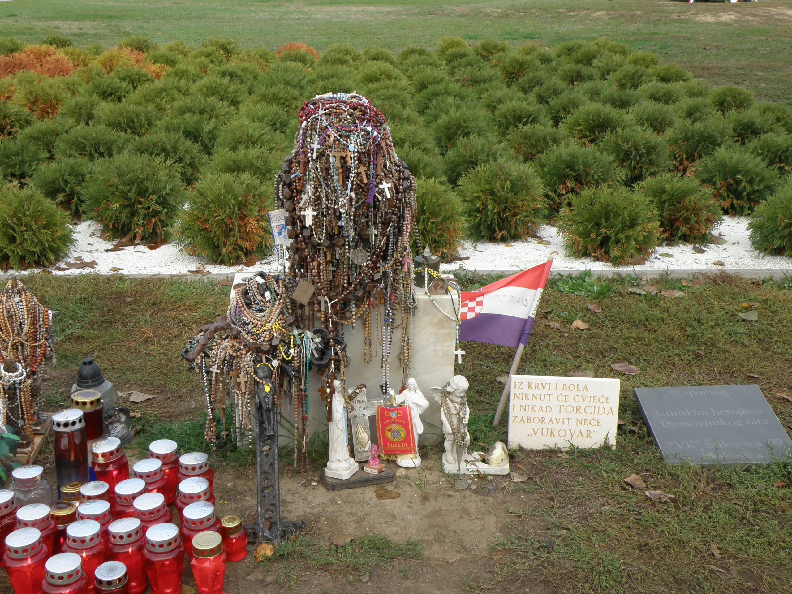Tamo je posađeno dvjesto grmića za poginule branitelje, a ispred njih se nalazi križ koji je pokriven mnogobrojnim krunicama. Izmolili smo molitvu za sve poginule na ovom mjestu. Sljedeće odredište bilo je Memorijalno groblje žrtava Domovinskog rata s tisuću bijelih križeva osoba stradalih u borbi za Vukovar. Na sredini groblja se nalazi ogroman spomenik koji u sredini ima vječno zapaljenu vatru.