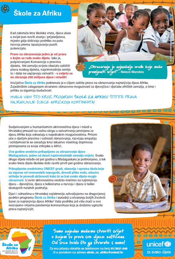 Pravo na obrazovanje jedno je od temeljnih dječjih prava s kojim se rađaju sva djeca na svijetu, no koje za milijune njih još uvijek nije ostvareno. Kako bi to promijenili, UNICEF i odgojno-obrazovne ustanove diljem Hrvatske provode program Škole za Afriku koji ujedinjuje edukaciju o dječjim pravima, osnaživanje djece u našoj zemlji te humanitarni rad kojim zajedno stvaramo obrazovne mogućnosti za najranjiviju djecu afričkih zemalja. Više o programu pročitajte na www.unicef.org/croatia/skole-za-afriku.