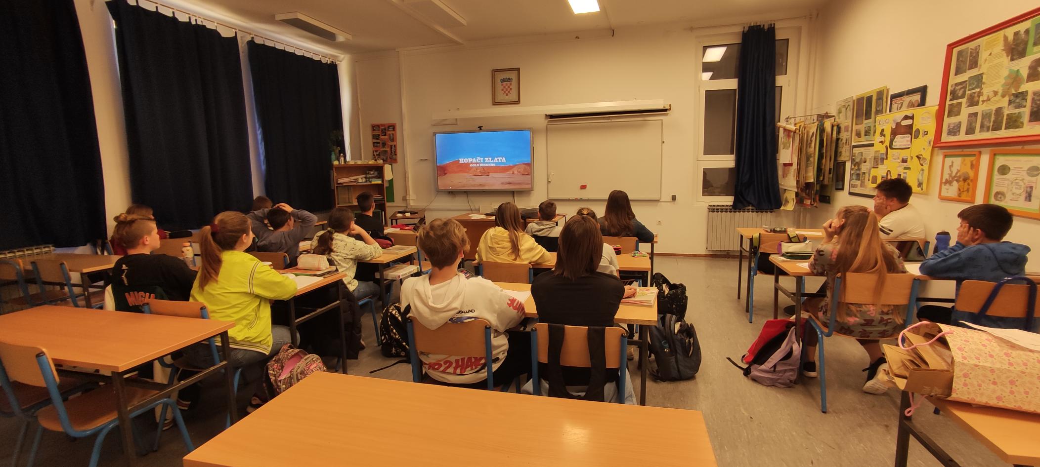 Učiteljica Ana Manjaka i učenici 5.e i 6.e razreda gledali su i analizirali najnovije filmove za učenike osnovne škole s portala Filmska naSTAVa - dokumentarni film „Buđenje za pamćenje“ i animirane filmove „“Pjevajuća vešmašina“, „Kopači zlata“ i U gori raste zelen bor“.