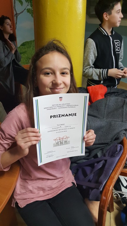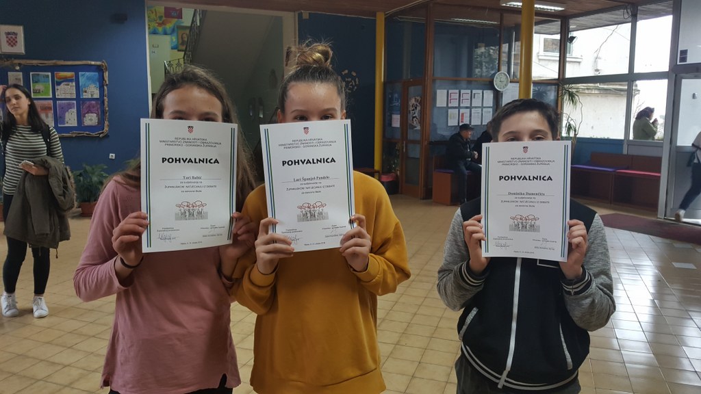 Sa međužupanijskog natjecanja u debatiranju koje se održalo u Rijeci 9. i 10. ožujka ponovno stižu odlične vijesti - od 12 debatnih timova iz Primorsko-goranske, Istarske i Ličko-senjske županije, naš je klub ostvario tri pobjede od mogućih četiri i osvojio 2. mjesto, dok je Tara Babić, učenica 7.a razreda nagrađena 1. mjestom kao najbolja govornica cijeloga turnira! I preostalo dvoje govornika našeg kluba ostvarili su izuzetno dobre rezultate - od 32 debatanata na turniru, Dominik Dumenčić proglašen je 4., a Lara Španjol-Pandelo 7. najboljom govornicom turnira.