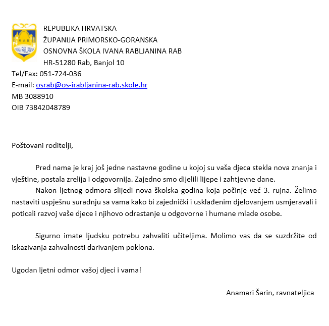 Poruka ravnateljice roditeljima