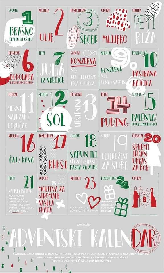 Najavljujemo već tradicionalnu humanitarnu akciju prikupljanja trajnih namirnica za najpotrebnije obitelji našega otoka, koja se ove godine odvija u suradnji s međužupnim Caritasom otoka Raba pod geslom: "Ljubav nema granice, ljubav nema stanice" od ponedjeljka 3. prosinca do srijede 19. prosinca.