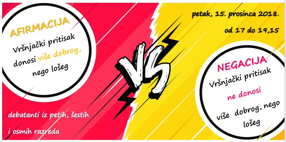 Za sam kraj Mjeseca borbe protiv ovisnosti, debatni klub naše škole organizira mini turnir koji će se održati ovaj petak, 15. prosinca 2018. u popodnevnoj smjeni. Mlađi debatanti pridružit će se iskusnijim osmašima u četiri ekipe te će od 17 sati do 18,45 debatirati na tezu: Vršnjački pritisak donosi više dobrog, nego lošeg.