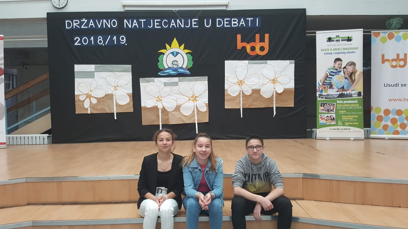 Tara Babić, Lara Španjol-Pandelo i Dominik Dumenčić kao ekipa Rab1 Debatnog kluba naše škole natjecali su se na državnom Natjecanju u debati 3. i 4. svibnja 2019. Natjecanje je održano u Zagrebu, u Osnovnoj školi Zapruđe. Debatante su pripremale i pratile voditeljice kluba Tanja Rizner i Gabrijela Ševerdija.