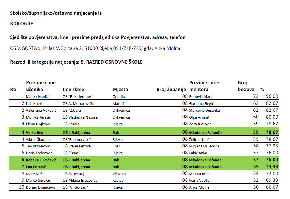 Županijsko natjecanje iz biologije održano je 14. ožujka 2012. u OŠ Vladimira Gortana u Rijeci. Antonio Galić, Vinko Beg, Rebeka Lukačević i Ena Paparić ostvarili su zavidne rezultate...