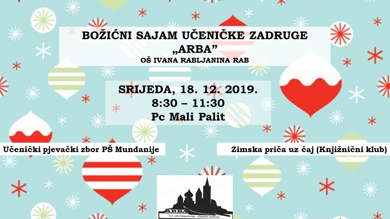 U srijedu 18. prosinca od 8:30 do 11:30 u PC Mali Palit održat će se božićni sajam Učeničke zadruge Arba OŠ Ivana Rabljanina Rab. Pozivamo sve prolaznike i otočane da navrate i pogledaju što su sve pripremile vrijedne ruke naših učenika i njihovih roditelja. Za dobru atmosferu na sajmu pobrinut će se i Učenički pjevački zbor PŠ Mundanije koji će prolaznike ugrijati pjesmom te Knjižnični klub koji će pravom zimskom pričom uz topli čaj razveseliti najmlađe.