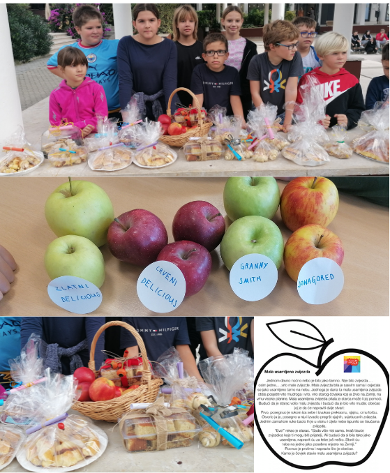 Povodom Dana jabuka 2. i 4. r. pridružio se eTwinning projektu - Dan jabuka 2022. Cilj projekta je upoznati učenike s utjecajem jabuke na naše zdravlje, vrstama jabuka i proizvodima od jabuke. Učenici su na kreativan način i kroz razne radionice ostvarili sve zadaće ovoga projekta. Projekt smo započeli s istraživanjem sadržaja vezanog za jabuke. Istražili smo povijest jabuka, sorte, dobrobiti, poslovice i razne druge zanimljivosti. Izradili smo tematski plakat. Čitali smo priču Mala usamljena zvijezda, pronašli skrivenu zvijezdu u jabuci i zaključili da se i u svakom od nas skriva zvijezda. Svatko od nas napisao je pjesmu i monolog o jabuci. Koristili smo rimu, personifikaciju i usporedbe. Zanimljivo nam je bilo slikati jabuke prema promatranju kao i izrada edukativne razredne igre Jabuko ne ljuti se. Najslađi dio projekta bio je vezan uz izradu pekmeza od jabuka i pečenje palačinki. Izradu slastica nastavili smo s roditeljima. Ispekli smo raznovrsne kolače s kojima smo sudjelovali na prodajnom sajmu. Nakon provedenih aktivnosti učenici su putem ankete iskazali mišljenje o projektu. Zaključak bi svakako bio: Radujemo se Danu jabuka i sljedeće godine!