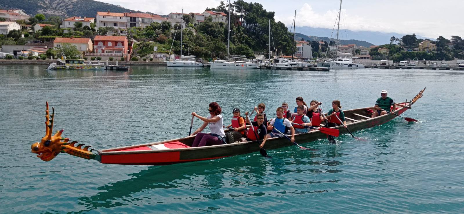 U ponedjeljak, 8. svibnja, učenici 2. i 4.r. iskušali su se u veslanju tradicionalnog kineskog čamca dugačkog 13 m poznatog po imenu Dragon boat. Uz vodstvo Željka Rogića, poznatog hrvatskog kajakaškog trenera, učenici su učinili prve veslačke zaveslaje u ,,zmajskom čamcu,,. Osnove tehnike prvo su iskušali u luci Rab, a zatim su se hrabro otisnuli i prema pučini. Sreći nije bilo kraja! Uz pjesmu i veselje povratak je bio puno lakši, a vesela i radosna lica govorila su da je ovo bilo jedno nezaboravno iskustvo koje treba ponoviti.