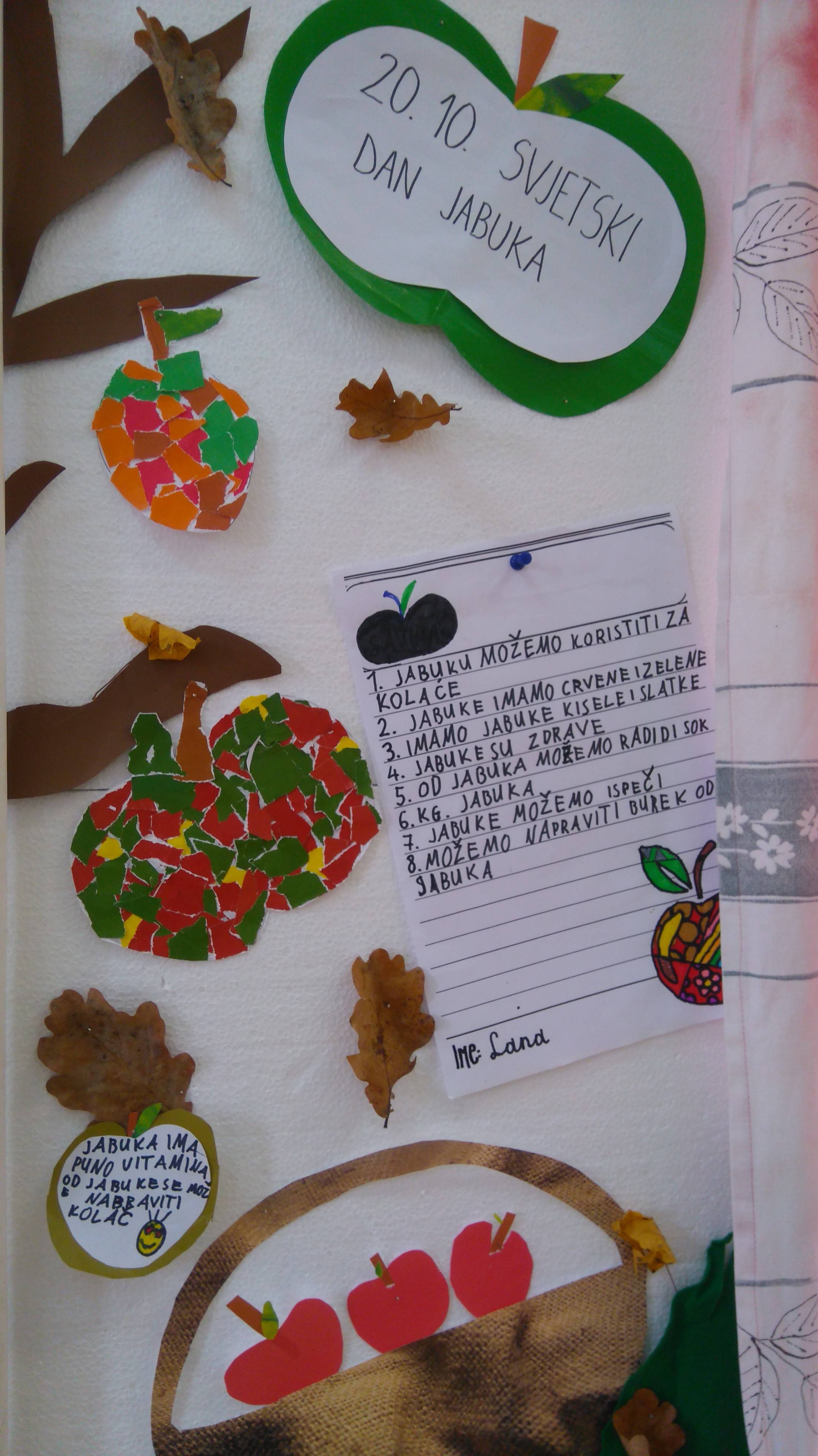 Tjedan jabuka u produženom boravku protekao je jako zabavno i kreativno. Dosta smo toga znali, ali i imali prilike naučiti nešto novo o jabuci kao zdravoj namirnici (zašto se naziva kraljicom voća, što se sve može napraviti od jabuka, kako se može jesti, itd.). Pano smo ukrasili jabukama koje su učenici izrađivali trgajući kolaž papir (u obliku mozaika). Također, učenici su pokazali intres i zadovoljstvo u istraživačkom radu. Svaki od učenika trebao je donijeti jednu jabuku te prethodno saznati pojedine zanimljivosti o njoj (podrijetlo, boju, okus…). Istražili su i pojedine recepte (sastojke i način pripreme) koji se rade od jabuka. Pričali smo o njima, njihovim okusima, mirisima, oblicima.