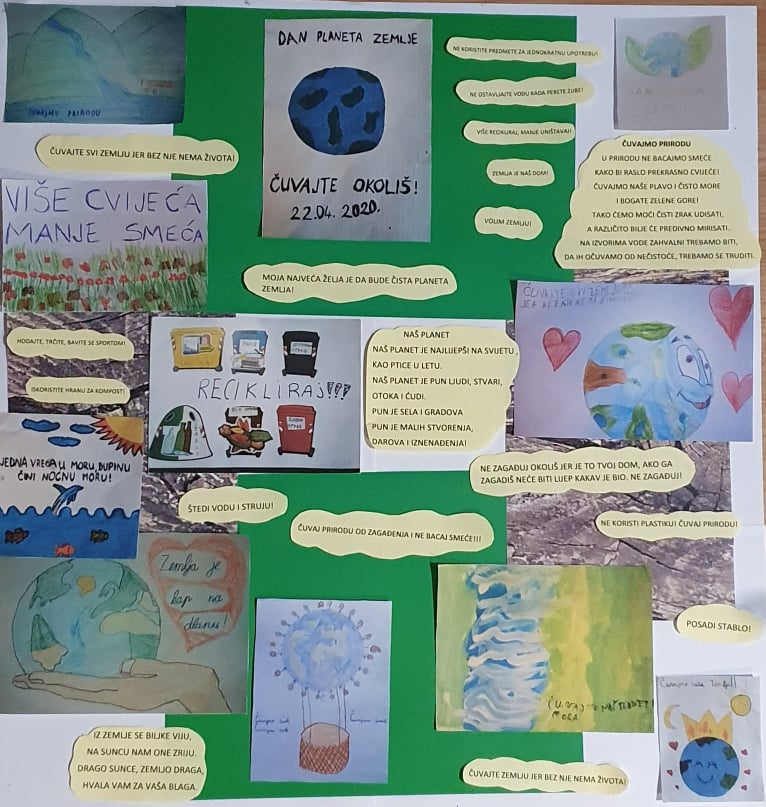 Naime, realizacija jednog ovakvog projektnog dana, kao i ostalih nastavnih dana u vrijeme škole na daljinu, zahtijeva veliki trud i suradnju roditelja i učenika. Svjesni negativnosti koje žaloste Zemlju, učenici su, uz prigodne crteže, napisali pjesmice i poruke kojima potiču na očuvanje okoliša.