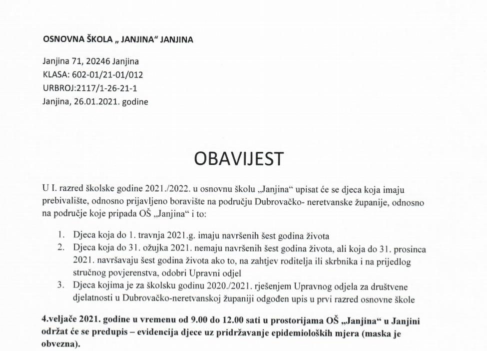 Obavijest o predupisu djece u I.razred u OŠ Janjina za šk. 2021./22.