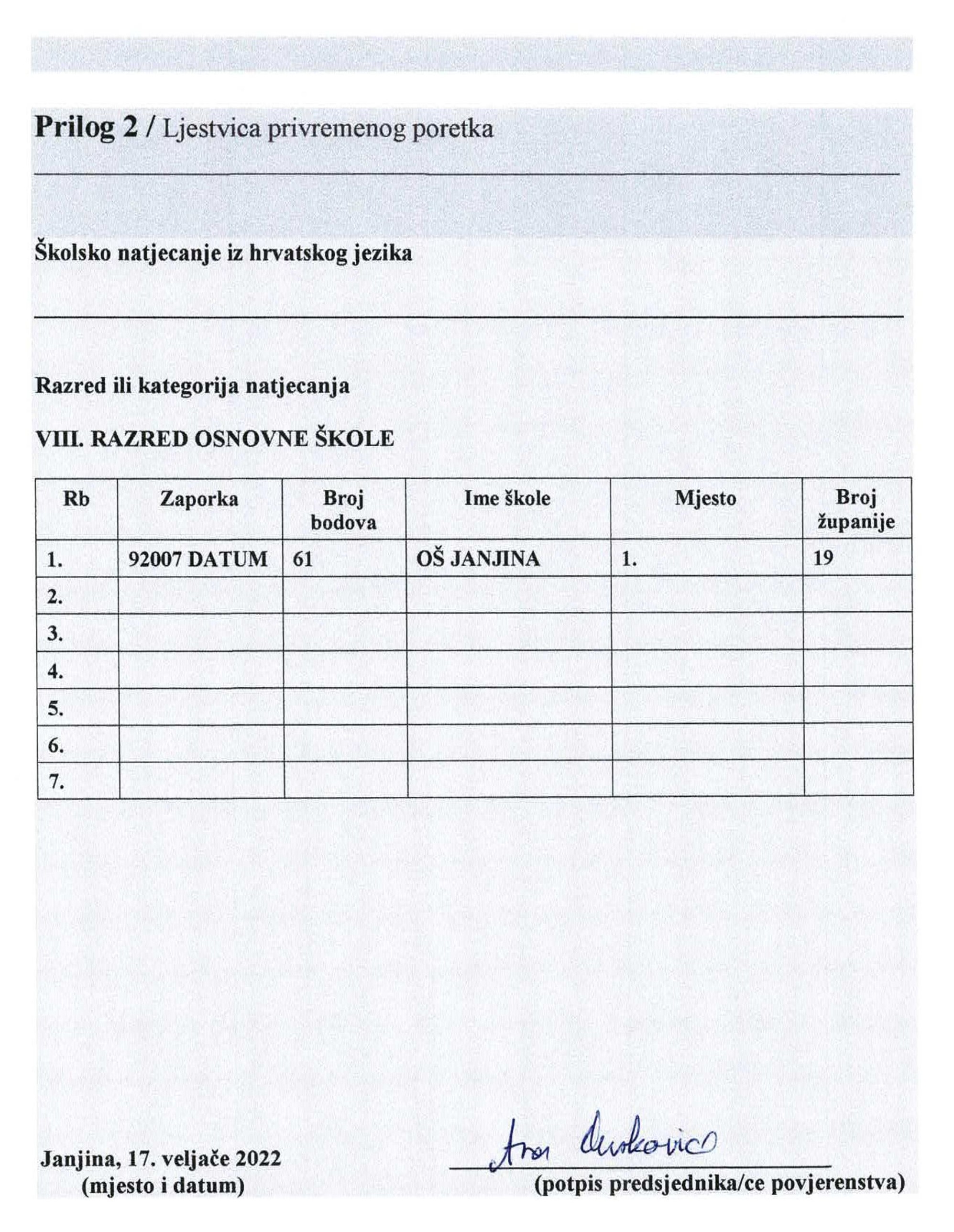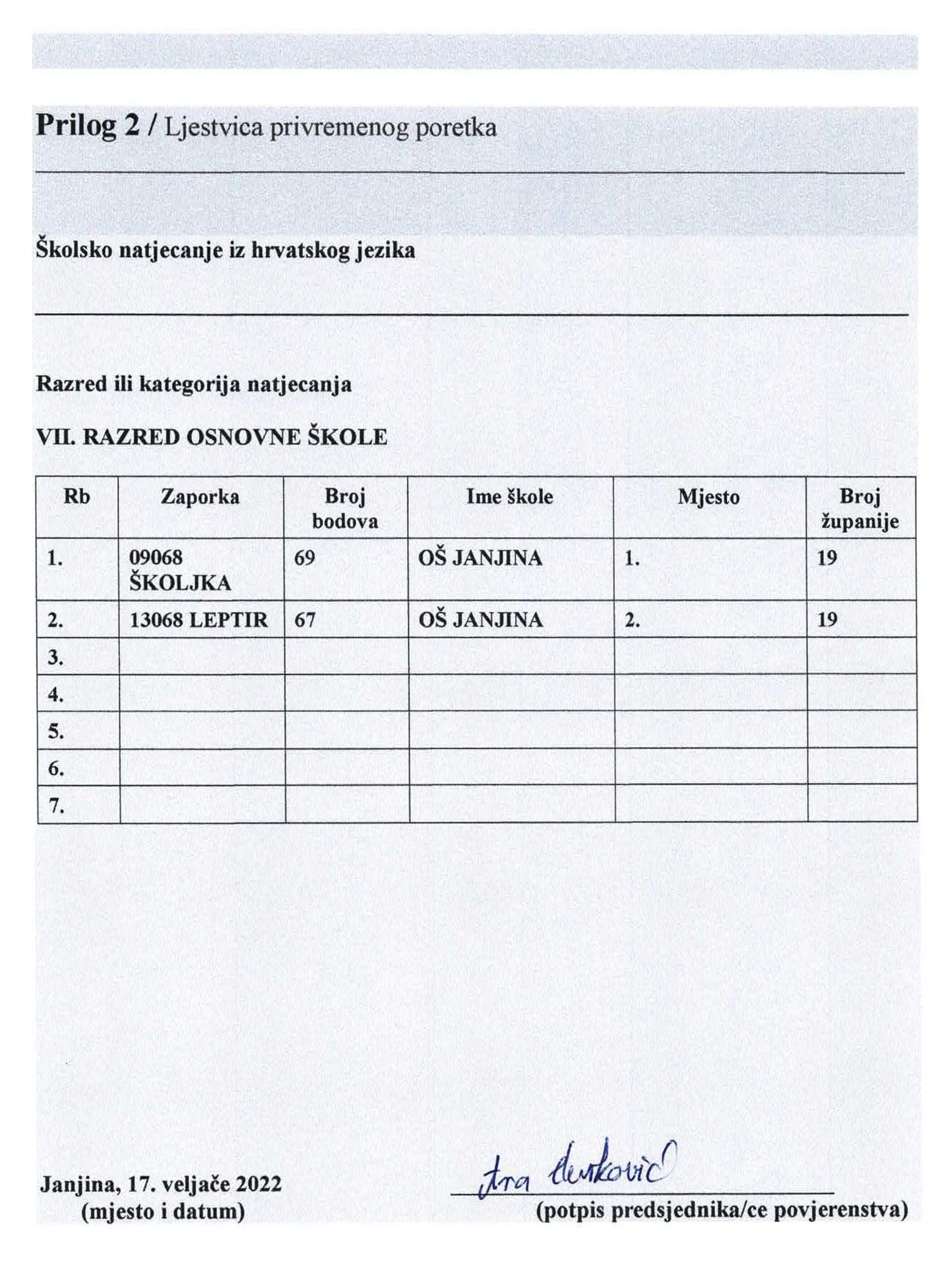 Rezultati natjecanja iz Hrvatskog jezika - ljestvica privremenog poretka