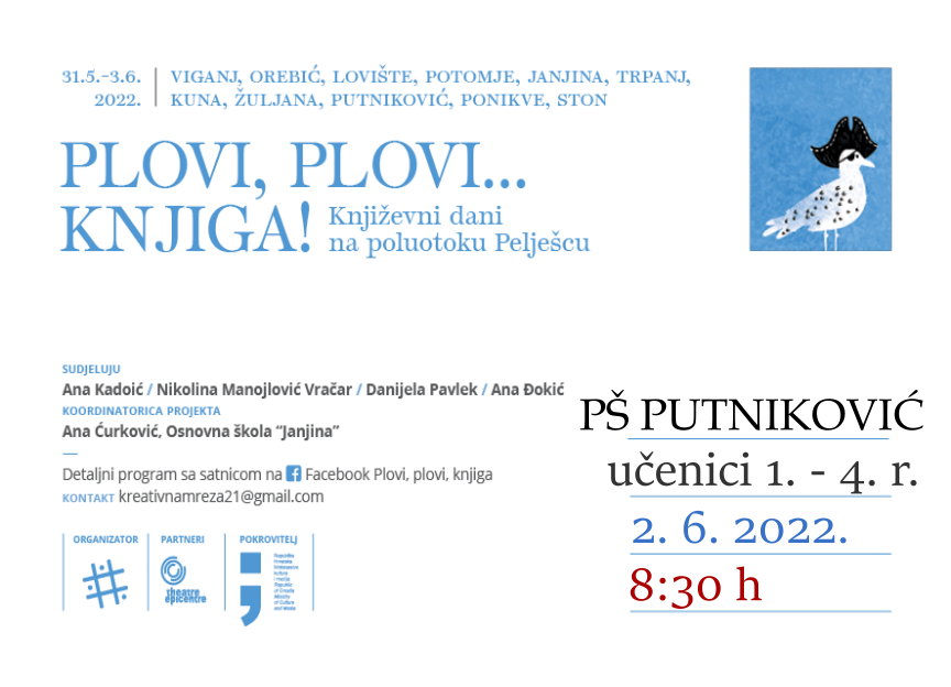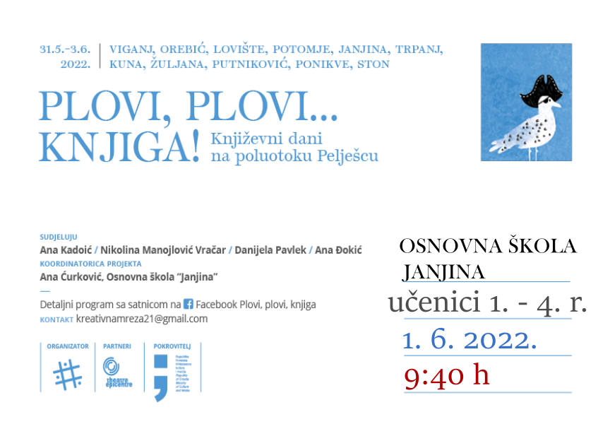 Ove će godine u našoj školi biti održani književni susreti za učenike 1. - 4. razreda u okviru programa "Plovi, plovi...knjiga!" koji organizira Kreativna mreža. Susreti će se održati u školama na cijelom Pelješcu, a svrha ovog programa je omogućiti učenicima i na udaljenim mjestima susrete s pravim piscima. U našoj školi...