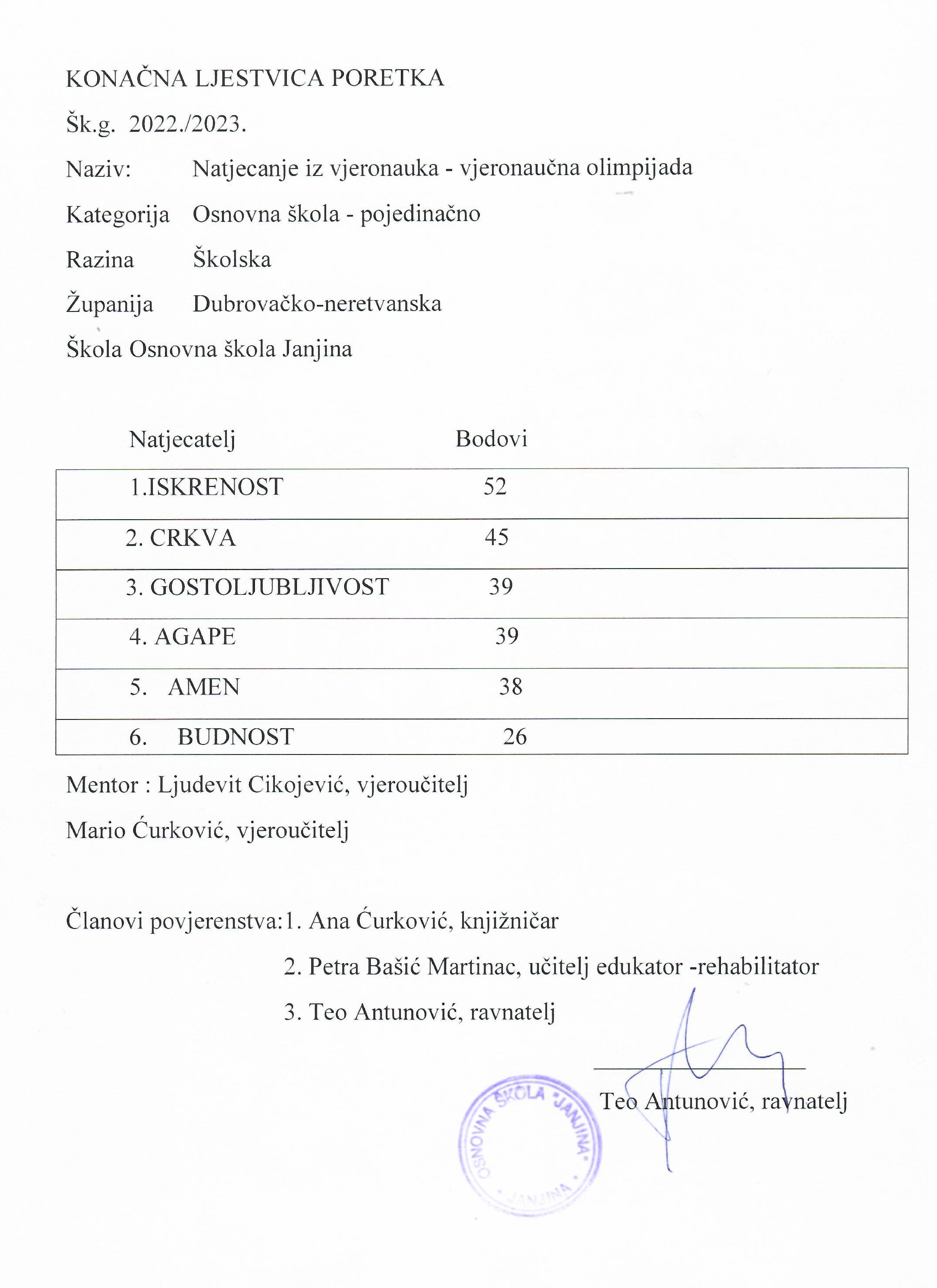 Konačna ljestvica poretka Vjeronaučne olimpijade - školsko pojedinačno natjecanje