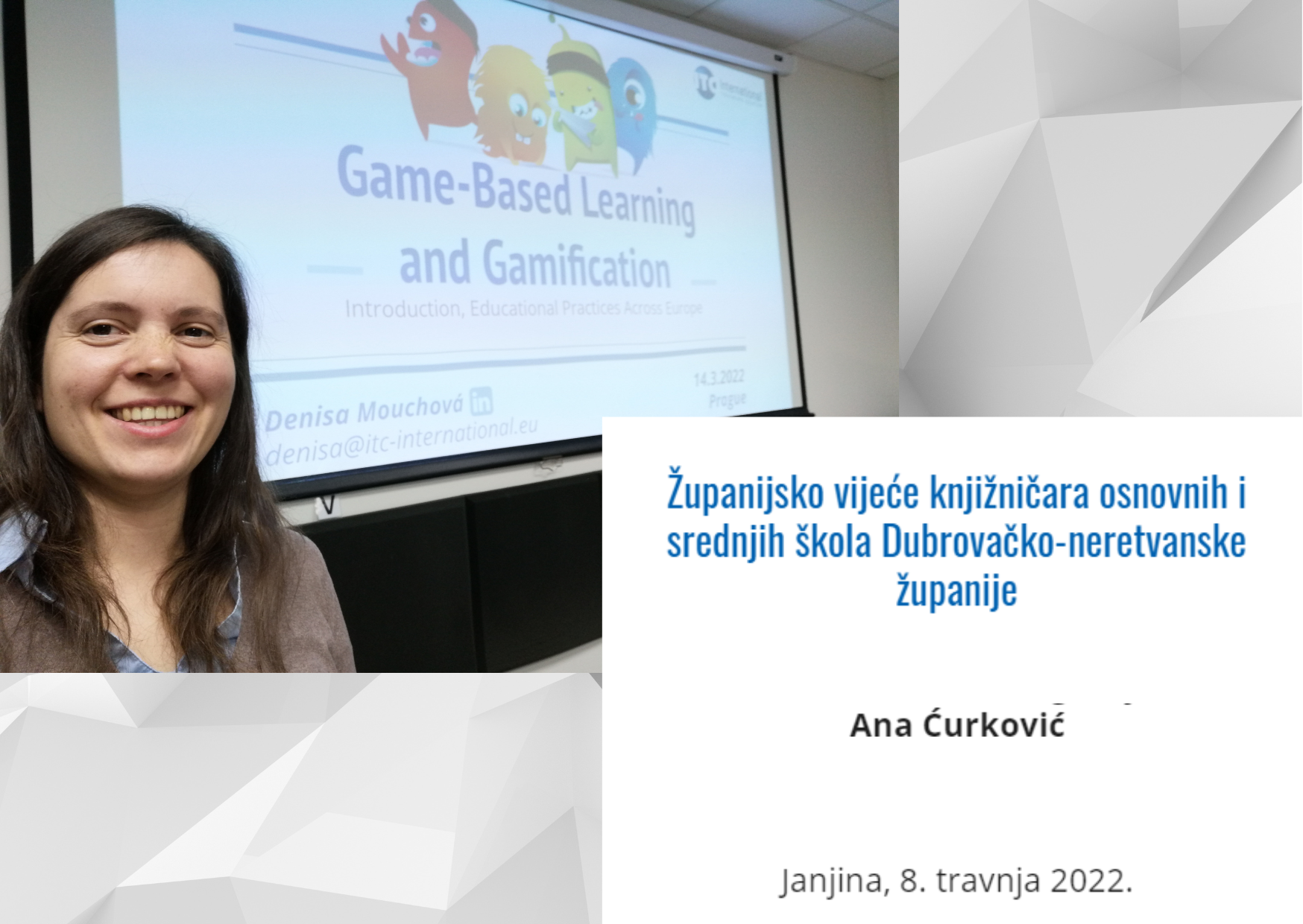 Knjižničarka Ana sudjelovala je na Županijskom stručnom vijeću školskih knjižničara Dubrovačko-neretvanske županije koji se održavao na mreži 8. travnja 2022. god. Predstavila je projekt "Radosno dijete - napredna škola" i strukturirani tečaj o igrifikaciji na kojem je imala priliku upoznati strategije igrifikacije u nastavi.