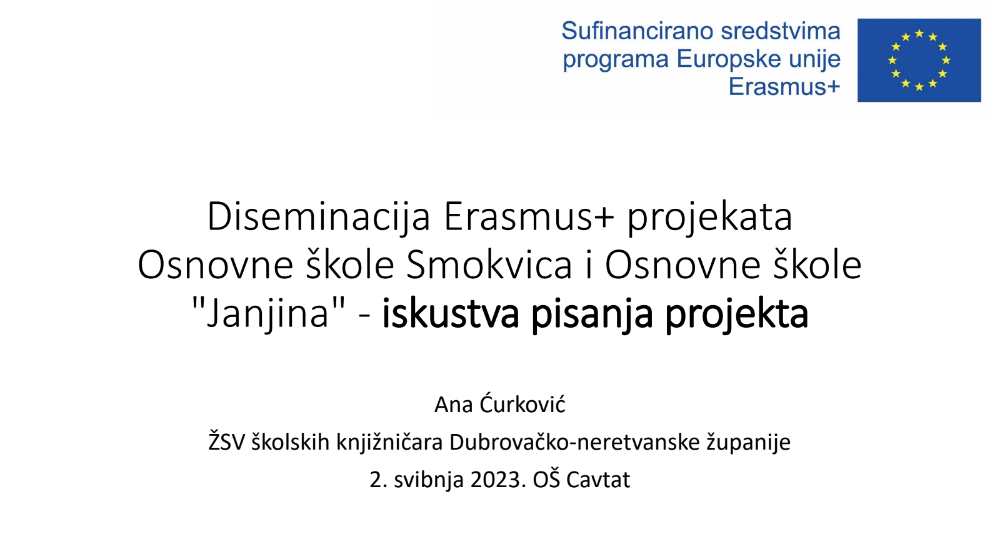Knjižničarka Ana Ćurković predstavila je Erasmus+ projekte na kojima je projektna koordiantorica u Osnovnoj školi Smokvica ("Naš zeleni početak") i Osnovnoj školi "Janjina" ("Radosno dijete - napredna škola") na županijskom stručnom vijeću školskih knjižničara DNŽ koje se održalo u 2. svibnja 2023. u OŠ Cavtat. Naglasak predavanja bio je na iskustvu pisanja projekta općenito kako bi se potaknule ostale kolege na uključivanje u Erasmus+ program.