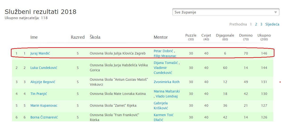 Kategorija: Logo - 1. mjesto Algoritmi - 2. mjesto. Juraj je pozvan je na državno natjecanje iz obje kategorije, koje će se održati 13. - 16. ožujka 2018. godine u Primoštenu. Čestitke Juraju na ostvarenom uspjehu!!! Mentor: Petar Dobrić, prof. Vanjski mentor: Filip Mravunac(ZRS)