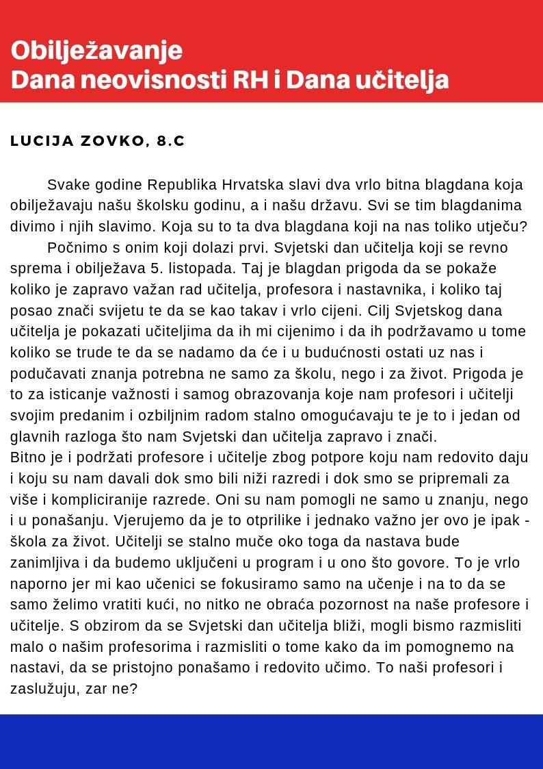 Obilježavanje Dana neovisnosti RH i Dana učitelja Svake godine Republika Hrvatska slavi dva vrlo bitna blagdana koja obilježavaju našu školsku godinu, a i našu državu. Svi se tim blagdanima divimo i njih slavimo. Koja su to ta dva blagdana koji na nas toliko utječu? Cijeli članak možete pročitati odabirom poveznice "više".