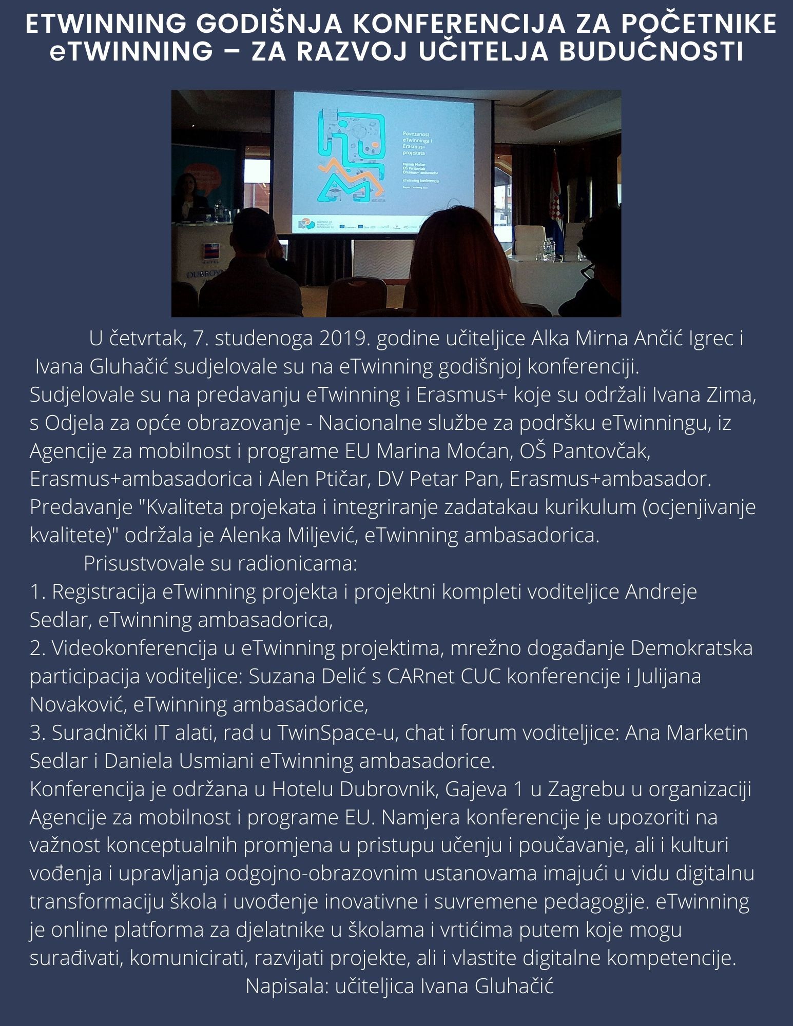 eTWINNING - ZA RAZVOJ UČITELJA BUDUĆNOSTI U četvrtak, 7. studenoga 2019. godine učiteljice Alka Mirna Ančić Igrec i Ivana Gluhačić sudjelovale su na eTwinning godišnjoj konferenciji. Cijeli članak možete pročitati odabirom poveznice „više“.