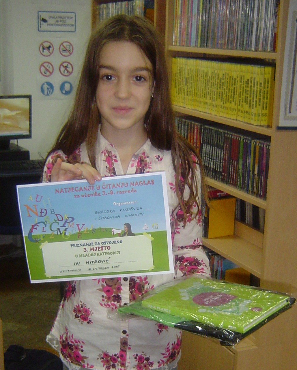 Sudionici natjecanja bili su učenici osnovnih škola grada Vinkovaca. Učenici su kroz svoja predstavljanja i čitanje ulomaka iz najdražih knjiga ponosno progovarali o ljepoti pisane riječi. Konkurencija je bila velika, ali naša učenica Iva Mitrović osvojila je 3. mjesto i ponosno predstavila našu školu!