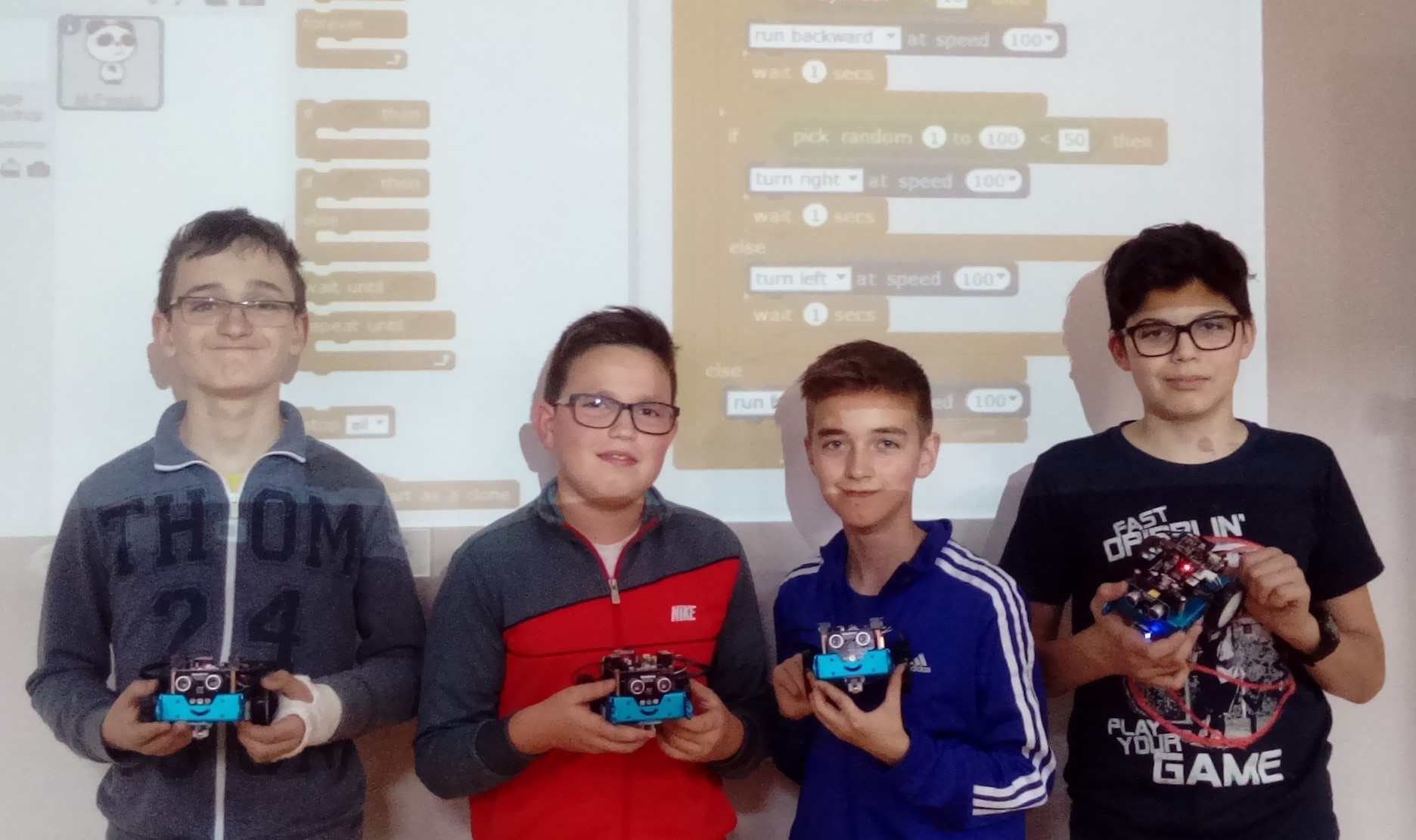 Tim naše škole se ubrzano priprema za prvo natjecanje koje se očekuje 3. svibnja 2016. Učenici Karlo Cindrić, 7. c, Matej Lončar, 6. b, Lovro Lešić, 6. a i Tomislav Celić, 7. c su već naučili programirati robota da svijetli kao semafor, svira raznu glazbu i kreće se učionicom, pomoću svojih motora i ultrazvučnih senzora. Učenike za natjecanje priprema učiteljica Informatike Mirjana Levanić, mag. inf. Prepoznali smo potencijal ove donacije i potrebu edukacije djece, u svrhu razvoja njihovih kompetencija u suvremenim tehnologijama, inovatorstvu i poduzetništvu te se još jednom ovim putem zahvaljujemo poduzetniku Nenadu Bakiću i udruzi IRIM na donaciji i pruženom povjerenju.