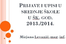 sastanak za 8. c razred, u utorak 3. prosinca 2013. u 17.00 sati za 8. a razred i u srijedu 4. prosinca 2013. u 18.00 sati za 8. b razred. Tema roditeljskih sastanka su: "Predprijave kandidata za potrebe provedbe elektroničkog upisa učenika u I. razred srednje škole u školskoj godini 2014./2015.". Klikom na opširnije možete pogledati prezentaciju s roditeljskog sastanka.
