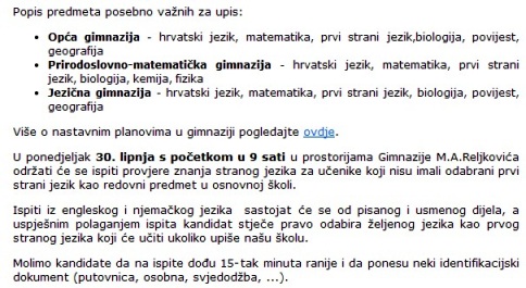 Na web stranici Gimnazije Matije Antuna Reljkovića, Vinkovci možete pronaći važne obavijesti vezane za upis učenika u prvi razred srednje škole. Provjera predznanja stranog jezika će biti u ponedjeljak 30. lipnja 2014. u 9 sati u toj školi.