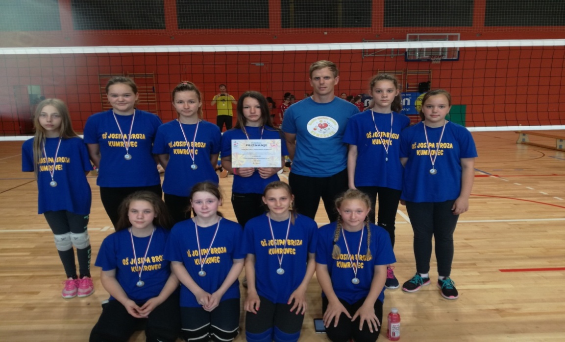 U utorak 15. svibnja 2018. u gradskoj sportskoj dvorani Varaždin naše su djevojčice predstavljale Krapinsko-zagorsku županiju na poluzavršnici državnog prvenstva u odbojci u kategoriji učenica 5. i 6. razreda. Na tom natjecanju nastupili su još prvaci sljedećih županija: OŠ Antuna Mihanovića Dubec – Grad Zagreb, OŠ Ivana Kukuljevića Sakcinskog Ivanec – Varaždinska županija, OŠ Vladimira Nazora Pribislavec – Međimurska županija i OŠ Čazma – Bjelovarsko-bilogorska županija. Predstavnici Koprivničko-križevačke županije nisu došli na natjecanje. Naša ekipa ždrijebom je smještena u skupinu B zajedno sa prvacima Međimurske županije – OŠ Pribislavec. Odličnom igrom i teško izborenom pobjedom 2-0 (25-23, 25-20) plasirali smo se u finale natjecanja. Tamo nas je čekala favorizirana ekipa iz Ivanca koja je bila bolja od Čazme i Dubca. Porazom od 2-0 (9-25, 10-25) u finalu naša je ekipa na kraju osvojila 2. mjesto. Prva je to medalja sa regionalnih natjecanja iz odbojke u konkurenciji djevojčica u povijesti naše škole. Povijesnu srebrnu medalju su osvojile: Tajana Gajšak (C), Valentina Maček, Anđela Antonić, Ana Preglej, Karolina Sporiš, Jasmina Ivanković, Mihaela Erdelić, Ivana Hunski, Klea Žnidarec i Ema Grmovšek. Čestitamo! Hvala Izabeli, Ani i Katarini na glasnoj podršci tijekom županijskog i regionalnog natjecanja. Školsko sportsko društvo Kumrovec