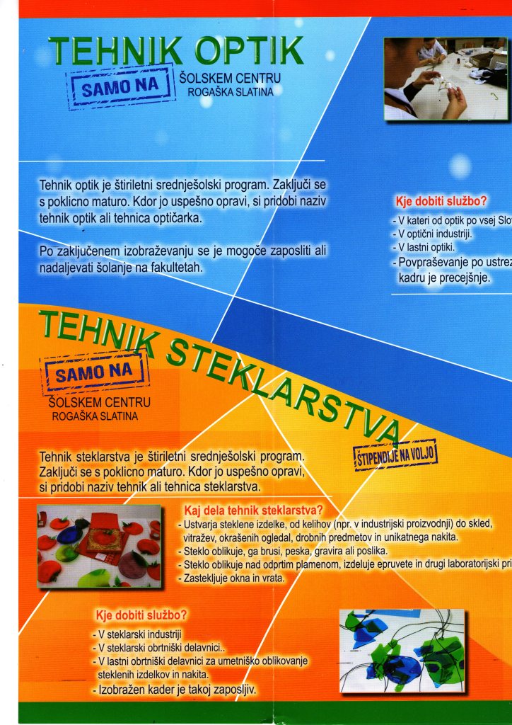 Za zanimanja staklarski tehničar i tehničar optičar u trajanju od 4 godine upisat će i učenike iz našeg kraja i ponuditi organiziran prijevoz uz granicu, od Bistrice ob Sotli do Rogaške Slatine. Za zanimanje staklarskog tehničara moguće je dobiti i slovensku stipendiju, a moguć je i smještaj u učeničkom domu. Ta su zanimanja veoma tražena u ovom dijelu Slovenije i dijelovima koji se bave staklarskom djelatnošću pa su govorili o mogućem brzom zaposlenju nakon završetka školovanja.