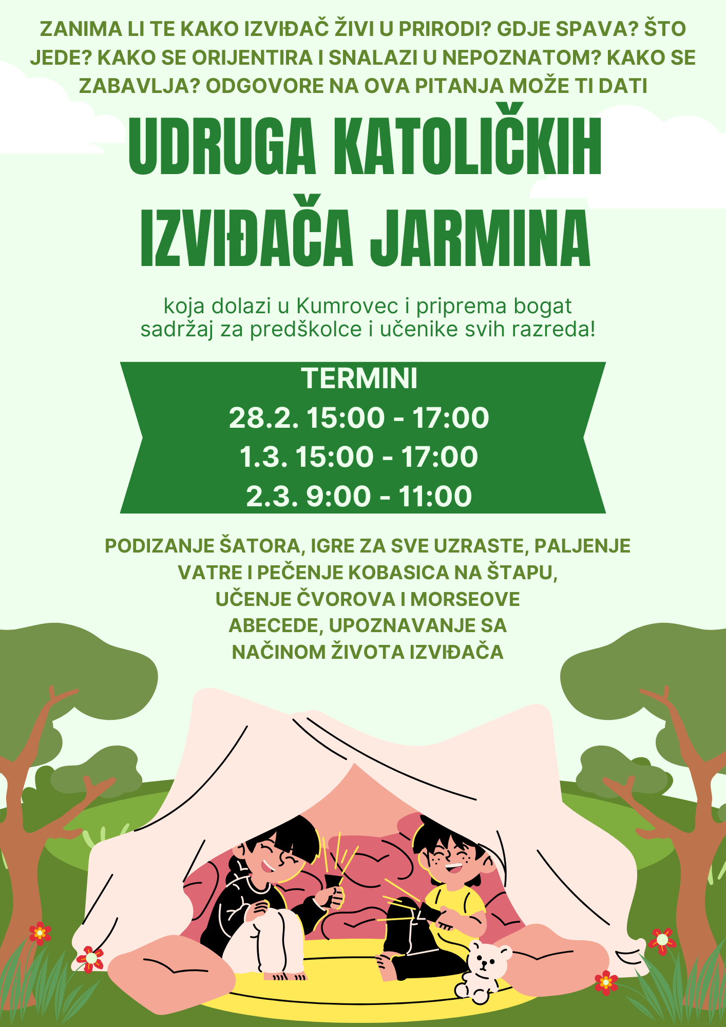 Zanima vas kako postati izviđač i što sve izviđači rade, kako se postavljaju šatori i još svašta zanimljivo... Radionice su namjenje za djecu od 6 do 14 godina. Termini su navedeni na plakatu.