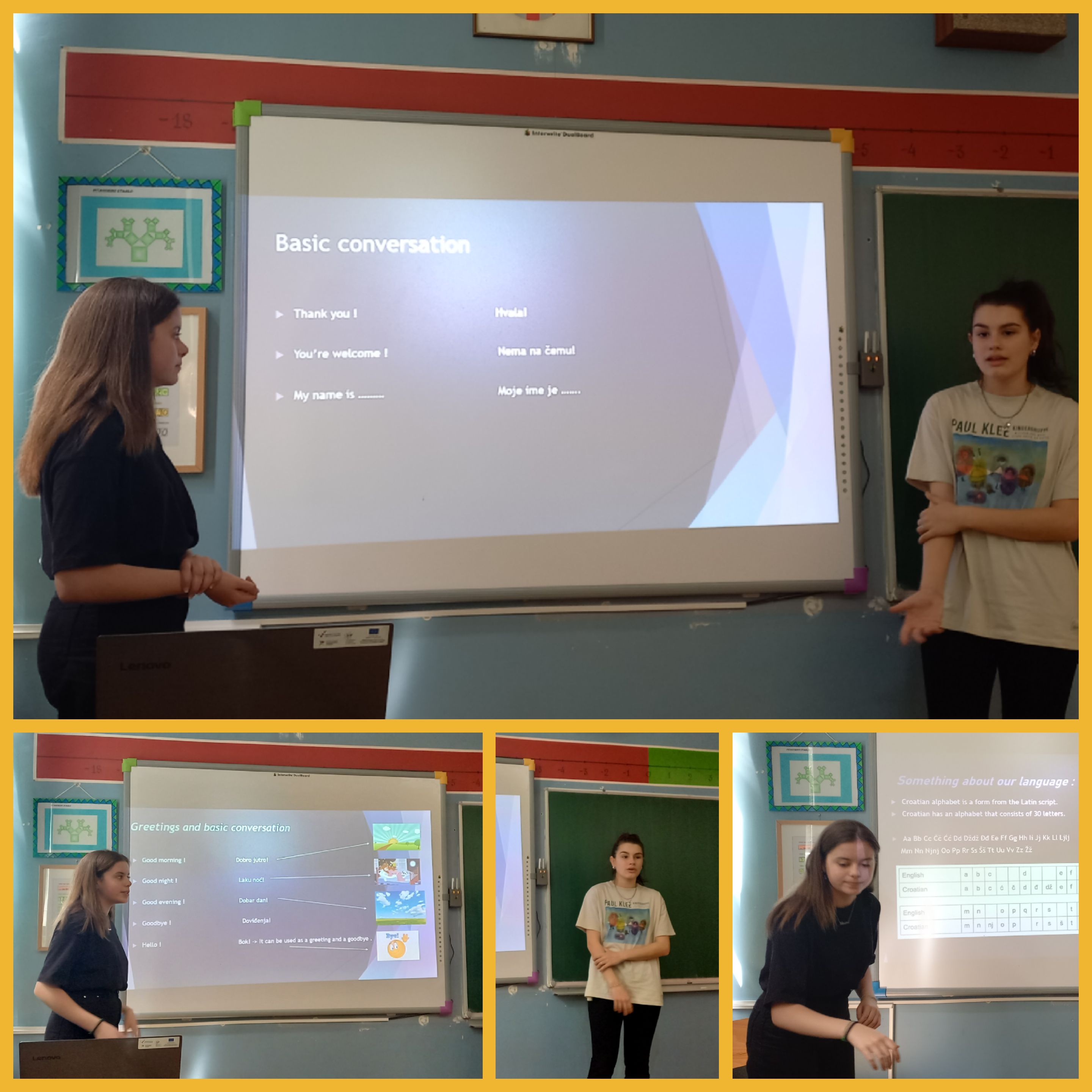 Zatim su učenice 8.b Lucija Berket i Morana Škopljanac održale kratak sat hrvatskog jezika za naše goste nakon čega je neplanirano uslijedio kratak tečaj rumunjskog jezika.
