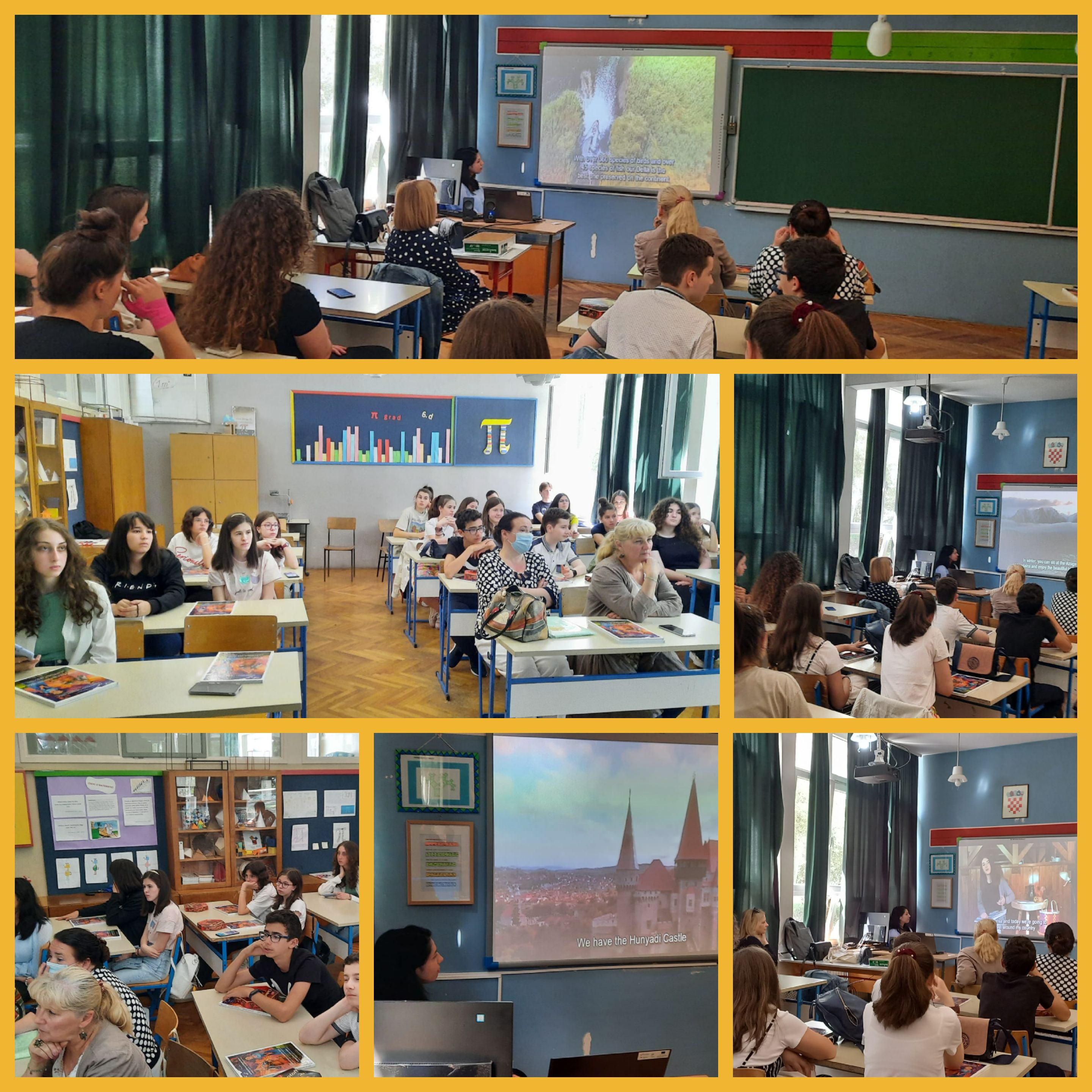 Nakon kraćeg druženja krenuli smo na radni dio posjeta. Učenici škole Colegiul Național Gheorghe Lazăr Sibiu iz Rumunjske zajedno s učenicima 8. b razreda koji pohađaju satove dodatne nastave engleskog jezika i ujedno sudjeluju na eTwinning projektima od 4. razreda, predstavili su svoje države, gradove, škole i poznate osobe svoga kraja na engleskom jeziku.
