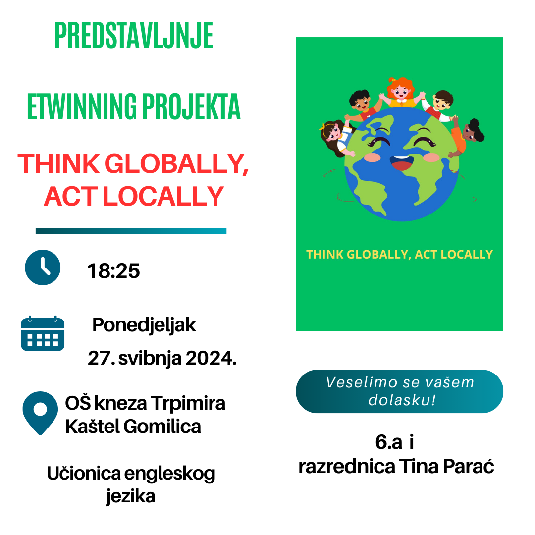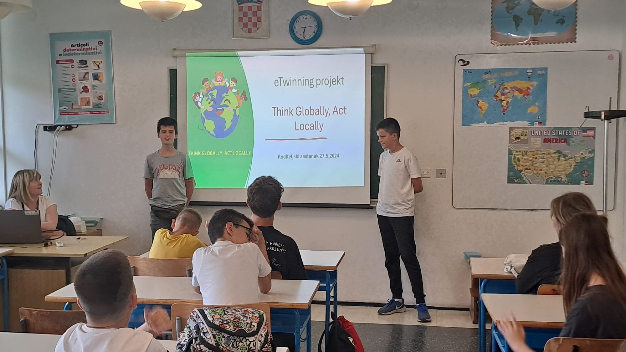 27.svibnja 2024. učenici 6.a razreda pozvali su svoje roditelje nna predstavljnje projektnih aktivnosti koje su odradili u sklopu međunarodnog eTwinning projekta "Think Globally, Act Locally".