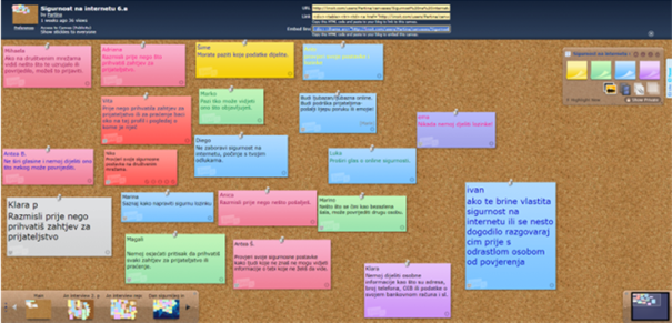Na idućem satu razrednika, učenicima je predstavljena lino ploča. Još jednom su razgovarali o sigurnosti na internetu. Razrednica ih je zamolila da na lino ploču napišu savjete o sigurnosti na internetu vezano uz dijeljenje osobnih podataka.