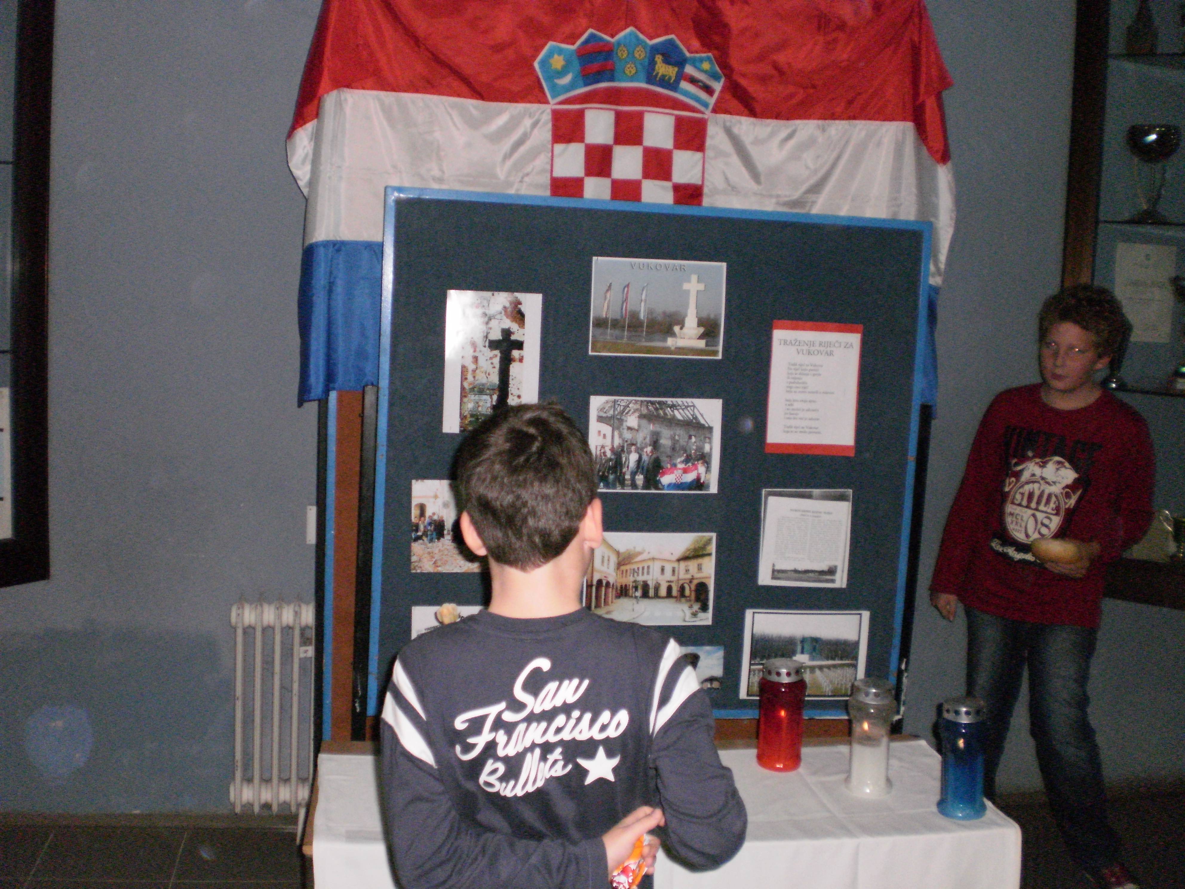 U ponedjeljak 19.studenog prigodnim programom u atriju škole obilježili smo Dan sjećanja na žrtve Vukovara. Program je vodila nastavnica Zlata Dubravčić koja je stihovima Kranjčevićeve pjesme „Moj dom“ povezala pjesme školskoga zbora, te nas tako uvela u prikladno domoljubno raspoloženje. Nastavnica Dubravčić ujedno je pozdravila oslobađajuću presudu Haškog suda za generale Antu Gotovinu i Mladena Markača prepoznavši u njoj pobjedu pravde. Na taj smo način dostojanstveno iskazali poštovanje i zahvalnost vukovarskim i svim nedužnim žrtvama Domovinskog rata.