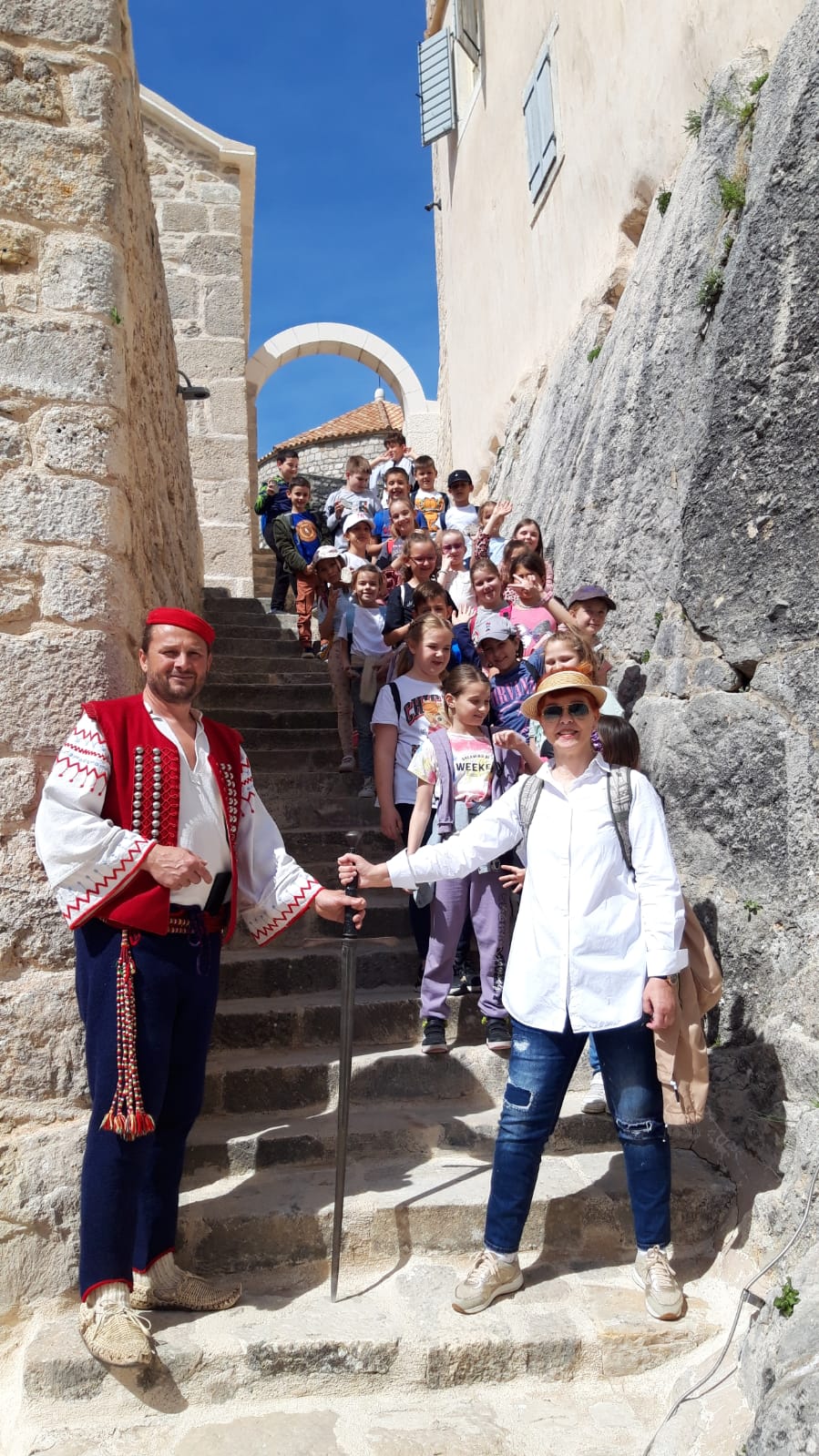 Učenici drugih razreda i njihove razrednice Davorka Jelavić, Ana Carev, Ines Tadin, Anka Rajčić, Jadranka Kovačević te pedagoginja Zrinka Zec, uputili su se 27. 4. 2023. i 28. 4. 2023. u Klis. Popeli smo se na klišku tvrđavu koja se uzdiže na goloj hridi i dijeli u dva dijela. Na ulazu nas je dočekao momak u uskočkoj odori. Udruga „Kliški uskoci“ je provela edukativnu radionicu za naše drugaše. U pratnji uskočkih vodiča razgledali su povijesne znamenitosti tvrđave Klis te izloške muzejske zbirke. Čuli su priču o povijesti tvrđave i zbivanjima u njoj i oko nje. Djeca su izradila gipsane suvenire kliške tvrđave koje su ponijeli kući. Sudjelovali su u gađanju mete tradicionalnim i sportskim lukom. Prezentirana im je tradicionalna tehnika Njemačke škole mačevanja mačevima „od ruke“ i „ruke i po“. Djeca su imala priliku promišljati o važnosti očuvanja baštine. Posebice im se svidjelo gađanje lukom, uskočka odora i oružje. Fotografije pogledajte u našoj fotogaleriji. Jadranka Kovačević, učiteljica
