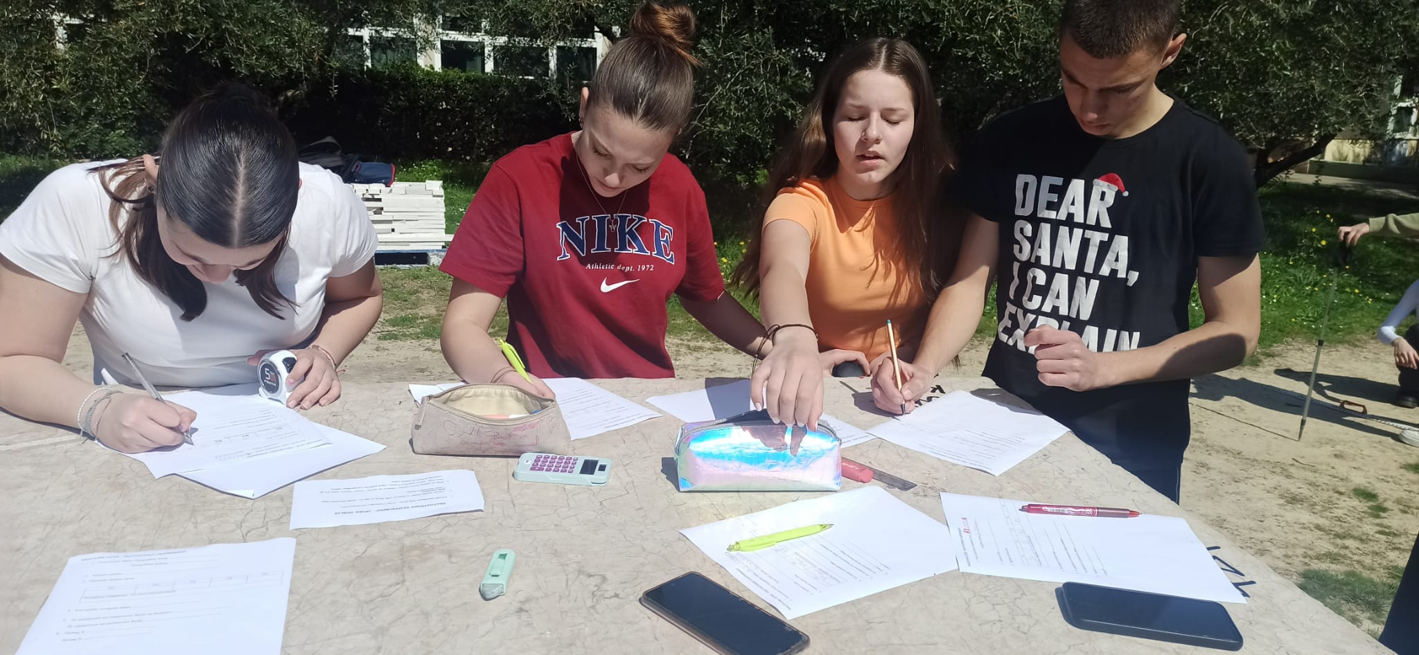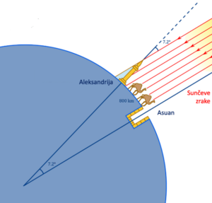 Ove godine naša škola se našla među 5877 škola iz 105 zemlalja svijeta koje su sudjelovale u Eratostenovm eksperimentu ( https://eratosthenes.ea.gr/) Eratosten ( Cirena, danas kraj Shahata u Libiji, oko 276. pr. Kr. - Aleksandrija, 194. pr. Kr.) je bio grčki geograf, kartograf, filozof, matematičar i astronom. Studirao je u Ateni i Aleksandriji. Smatra se utemeljiteljem geografije. Proslavio se svojim djelom O mjerenju Zemlje gdje je detaljno opisao postupak određivanja opsega Zemlje. Naime, Eratosten je znao za bunar u tadašnjoj Sieni ( današnji Asuan u Egiptu) gdje točno u podne, u vrijeme ljetnog suncostaja ( 21.6), sunčeve zrake obasjavaju samo vodu, a ne i zidove bunara kao inače. Zaključio je da sunčeve zrake tada moraju biti okomite iznad tla. Istog dana u podne u Aleksandriji primjetio je sjenu okomito postavljenog štapa , što je značilo da tu sunčeve zrake nisu okomite. Mjereći duljinu štapa i duljinu njegove sjene izračunao je kut upada sunčevih zraka ( 7.2 ˚ ). Imajući na umu da je Zemlja zakrivljena zaključio je da je to pedeseti dio Zemljinog punog kruga ( 360 ˚ : 7.2 ˚ = 50), a onda je i luk pedeseti dio kružnice, odnosno traženog opsega Zemlje. Nedostajao mu je samo podatak o udaljenosti između dva grada: Aleksandrije i Siene. Poslao je ljude koji su tu udaljenost izmjerili, a dobivenu udaljenost od 5 000 stadija pomnožio je sa 50 i dobio udaljenost od 250 000 stadija što odgovara današnjoj duljini od oko 40 000 km. Po uzoru na Eratostena, a uz pomoć učiteljice geografije Ružice Ivanković Ciotti i učiteljice matematike Maje Roguljić, učenici naše škole su na dan proljetne ravnodnevnice ( 21.3) točno u solarno podne (12.02) kada je Sunce u najvišoj točci iznad našeg meridijna ( 16˚ 23') izmjerili duljinu sjene okomitog štapa duljine 100 cm. Prosječna duljina sjene štapa iznosla je 91.4 cm. Budući, za vrijeme proljetne ravnodnevnice, Sunce okomito obasjava ekvator, štap na ekvatoru ne baca sjenu. To je bila naša Siena, dok je Aleksandrija bilo školsko dvorište. Pomoću programa Google Eartha određena je udaljenost naše škole od ekvatora od 4. 810 km. Matematičkim izračunima dobiven je kut upada sunčevih zraka od 43,5˚ , dok je dobiveni opseg Zemlje oiznosio 39.806, 9 km ( 360˚ : 43,5˚ = 8.2758, 4.810 km X 8.2758 = 39.806 km). Danas je poznato da prema satelitskim premjerima opseg Zemlje po meridijanu iznosi 40 008 km tako da, iako nešto odstupa od stvarne vrijednosti, naš opseg Zemlje možemo smatrati izvrsnim rezultatom ! Ružica Ivanković Ciotti