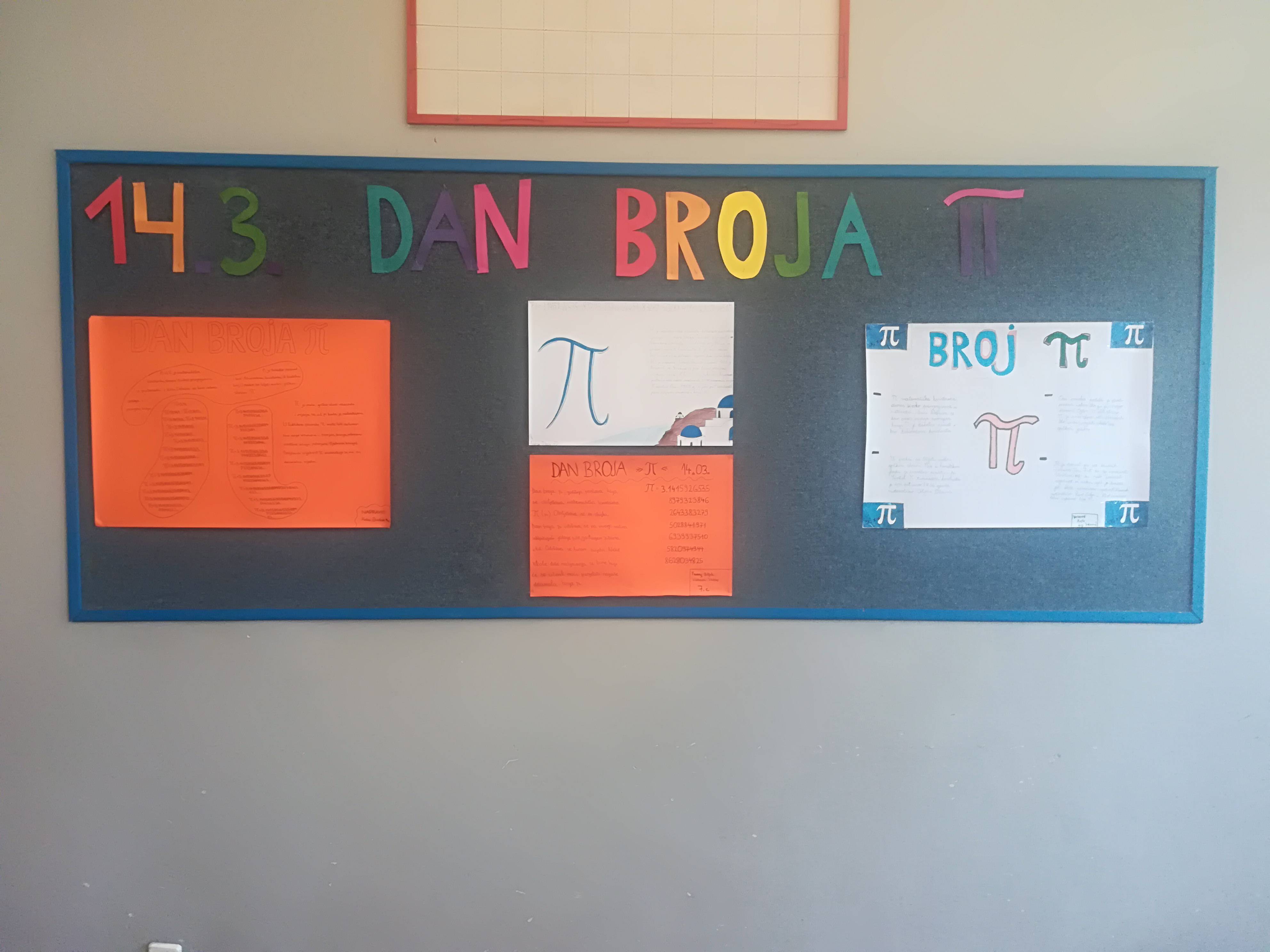 U srijedu, 14. 3. 2018. učenici sedmih razreda naše škole obilježili su svjetski dan broja Pi (π). Pi ili π je matematička konstanta, danas široko primjenjivana u matematici i fizici. Iznosi približno 3.14, zbog čega se svjetski dan broja Pi obilježava 14.3. 😊 Definira se kao omjer opsega i promjera kruga. Također je poznat i kao Ludolfov broj. Dan broja Pi održava se na mnogo načina pa su tako i naši sedmaši bili kreativni i s učiteljicom matematike Majom Roguljić obilježili taj dan (što se uklopilo u nastavu matematike budući da trenutno uče i koriste broj Pi). Potrudili su se napraviti plakate za učionicu matematike, a vrijedne ruke su ispekle i kolače s brojem Pi. 😊 Pogledajte fotografije njihovih radova.