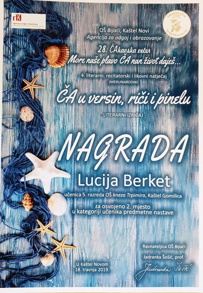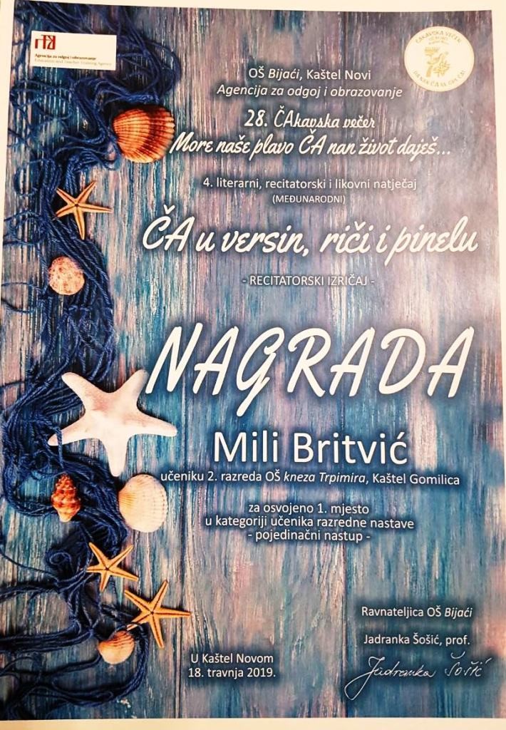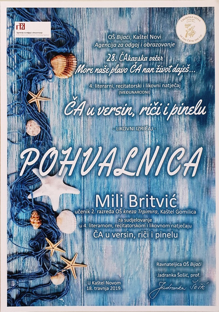 Učenici naše škole sudjelovali su na 4. međunarodnom literarnom, recitatorskom i likovnom natječaju ČA u versin, riči i pinelu. Natječaj se održava u sklopu 28. Čakavske večeri škole Bijaći iz Kaštel Novog, a organizatori su Agencija za odgoj i obrazovanje & OŠ Bijaći, Kaštel Novi. Radovi i sudionici pristigli su iz brojnih mjesta i škola Dalmacije, Istre, Hrvatskog primorja i škola iz unutrašnjosti, ali i iz Srbije, Slovenije, Bugarske, Makedonije i Poljske. Proglašenje pobjednika i dodjela nagrada održani su 18. 4. 2019., a taj isti dan održano je natjecanje u recitatorskom izričaju. Prosudbena povjerenstva su tjedan ranije procijenila likovne i literarne radove. NAGRAĐENI I POHVALJENI UČENICI NAŠE ŠKOLE: 1. Mili Britvić, učenik 2. e razreda osvojio je prvo mjesto u recitatorskom izričaju za uzrast osnovci- razredna nastava, pojedinačni nastup. Recitirao je pjesmu Mara Krpašinka, Tonča Petrasova Marovića. Mentorica je Jadranka Kovačević. 2. Lucija Berket, učenica 5. b razreda osvojila je drugo mjesto u literarnom izričaju za uzrast osnovci- predmetna nastava. Tema rada bila je Tamo di more grli kamen naš. Mentorica je Zlata Dubravčić. 3. Mili Britvić, učenik 2. e razreda pohvaljen je za svoj likovni rad u kategoriji osnovci-razredna nastava. Mentorica je Jadranka Kovačević. Dodjela nagrada provedena je uz raznovrstan program pod nazivom „Dica za dicu“. Tako su za naše učenike proljetni odmor i nadolazeći blagdani otpočeli u zadovoljstvu i slavljeničkom duhu. učiteljica, Jadranka Kovačević