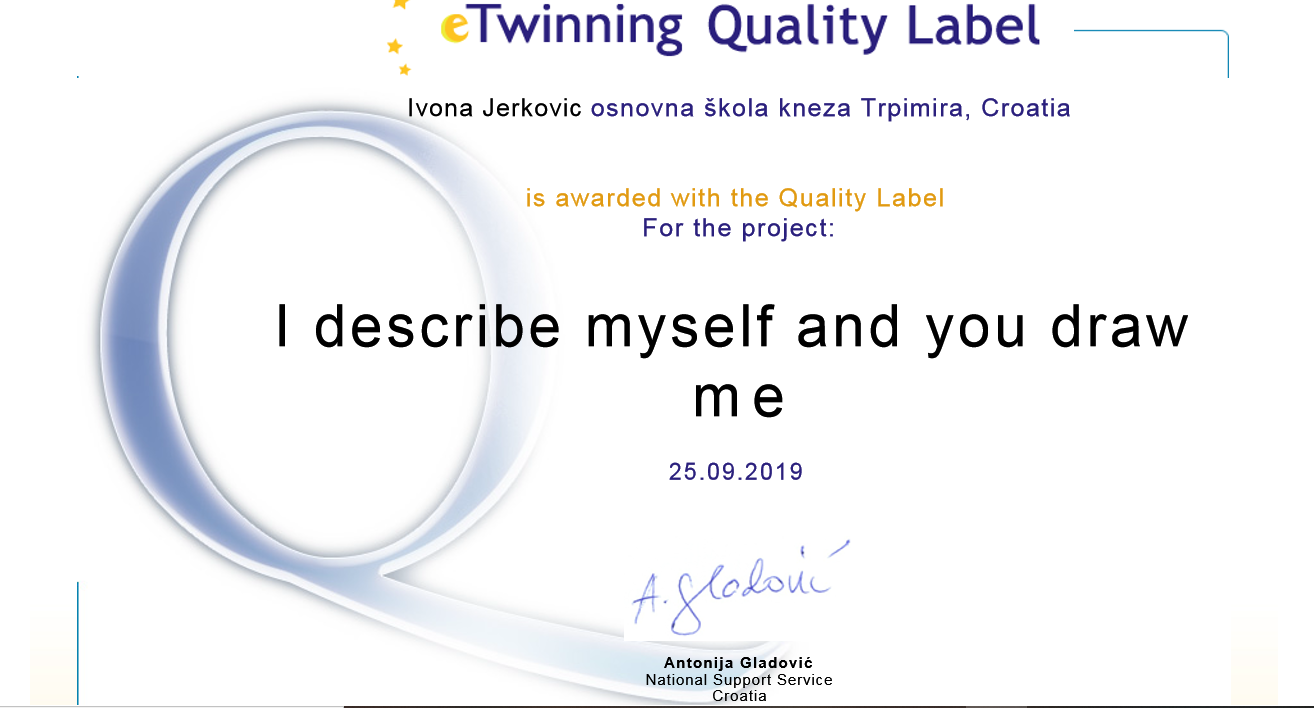 Još jedan naš eTwinning projekt, koji je uspješno proveden u školskoj godini 2018./2019. s grupom učenika talijanskog jezika osmih razreda, nagrađen je Nacionalnom oznakom kvalitete (Quality Label) od strane hrvatske Agencije za mobilnost i programe EU. Uskoro za isti projekt očekujemo i Europsku oznaku kvalitete. Inače, Europska oznaka kvalitete je druga oznaka koja se dodjeljuje projektima koji postižu određene europske standarde. Dodjeljuje je Središnja služba za podršku (CSS) učiteljima za rad na projektu: Ovim putem čestitamo našim bivšim osmašima na trudu i zalaganju koje je, očito, prepoznato!