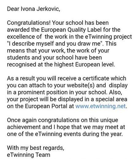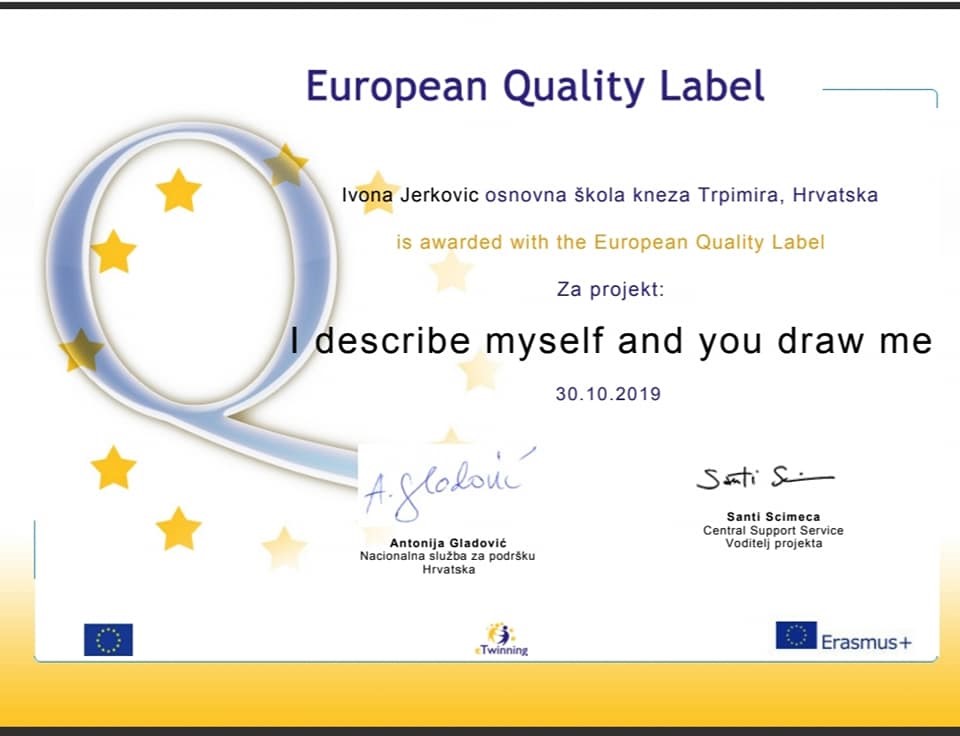 Jako smo sretni što se možemo pohvaliti još jednim uspjehom naših učenika i njihovih mentora. Naime, naši prošlogodišnji osmaši, učenici talijanskog jezika, sa svojom nastavnicom, Ivonom Jerković, nagrađeni su Europskom oznakom kvalitete za njihov eTwinning projekt „I describe myself and you draw me“.