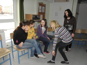 Druga radionica bila je “Govor tijela“ – vođenje slijepca“. Učenici su se podijelili u parove i zadatak im je bio da jedan učenik vodi drugog učenika koji ima zatvorene oči po razredu. Na ovaj način stavili smo ih u poziciju slijepe osobe, te im približi iskustvo slijepe osobe, a time im potaknuli društvenu svijest o životu slijepih osoba u našem društvu. Bilo im je jako zanimljivo i poučno iskustvo, uživali su u radionici.