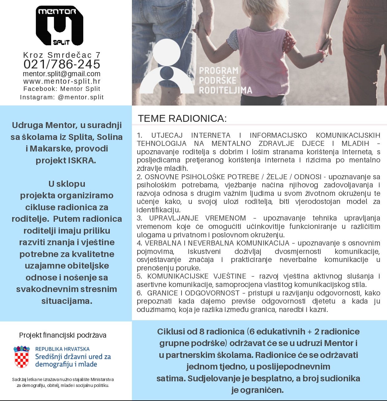 Poštovani roditelji, naša škola organizira radionice za roditelje u sklopu projekta pružanja podrške roditeljima za nošenje s izazovima roditeljstva pod nazivom Iskra, u suradnji s Udrugom Mentor, https://www.mentor-split.hr/. U sklopu projektnih aktivnosti planirane su radionice s temama osnovnih potreba, komunikacije, postavljanja granica u odgoju, upravljanja vremenom te utjecaja interneta i društvenih mreža na djecu i mlade, kako bi se osnažilo roditelje za nošenje s izazovima u odgoju povezanih s korištenjem interneta i društvenih mreža. Specifični ciljevi projekta su povećati svijest roditelja o rizicima za dobrobit i mentalno zdravlje djece povezanih s korištenjem mobilnih uređaja, interneta i društvenih mreža; pružiti roditeljima informacije o različitim načinima zaštite djece na internetu, uključujući postavljanje granica i sigurnosnih postavki na uređajima; osnažiti roditelje za uspostavljanje kvalitetnih odnosa s djecom, poboljšanje komunikacije i izgradnju povjerenja. Planirano je šest edukativnih radionica, dva online predavanja, dvije radionice grupne podrške, (individualno savjetovanje po potrebi). Radionice počinju slijedeći tjedan, u 19 sati, a jedna radionica traje 1 sat i 30 minuta. Sudjelovanje je besplatno, a broj sudionika je ograničen. Ukoliko želite sudjelovati na radionicama, molimo da se do petka prijavite ovdje: https://forms.office.com/e/nZFi6kYLM4 Ivna Grbavac, školska psihologinja