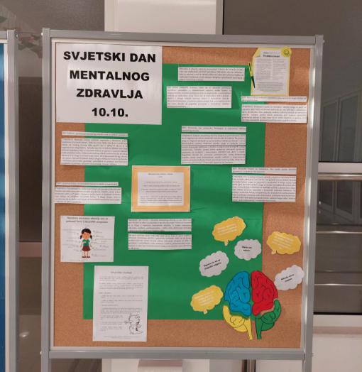 Povodom Svjetskog dana mentalnog zdravlja kojeg obilježavamo u sklopu Školskog preventivnog programa, u atriju škole postavljen je interaktivni plakat naziva "Sunce pozitive među oblacima briga". Dan mentalnog zdravlja je vrlo važno osvijestiti učenicima, kao i sam pojam mentalnog zdravlja te koliko je ono važno za funkcioniranje svakog čovjeka. Prošle godine smo za Dan mentalnog zdravlja u atriju istaknuli plakat s osnovnim informacijama o očuvanju mentalnog zdravlja i mitovima i istinama vezanima uz mentalno zdravlje, a ove godine smo na kreativan način htjeli s učenicima podijeliti pozitivne afirmacije koje im mogu pomoći u održavanju mentalne higijene.