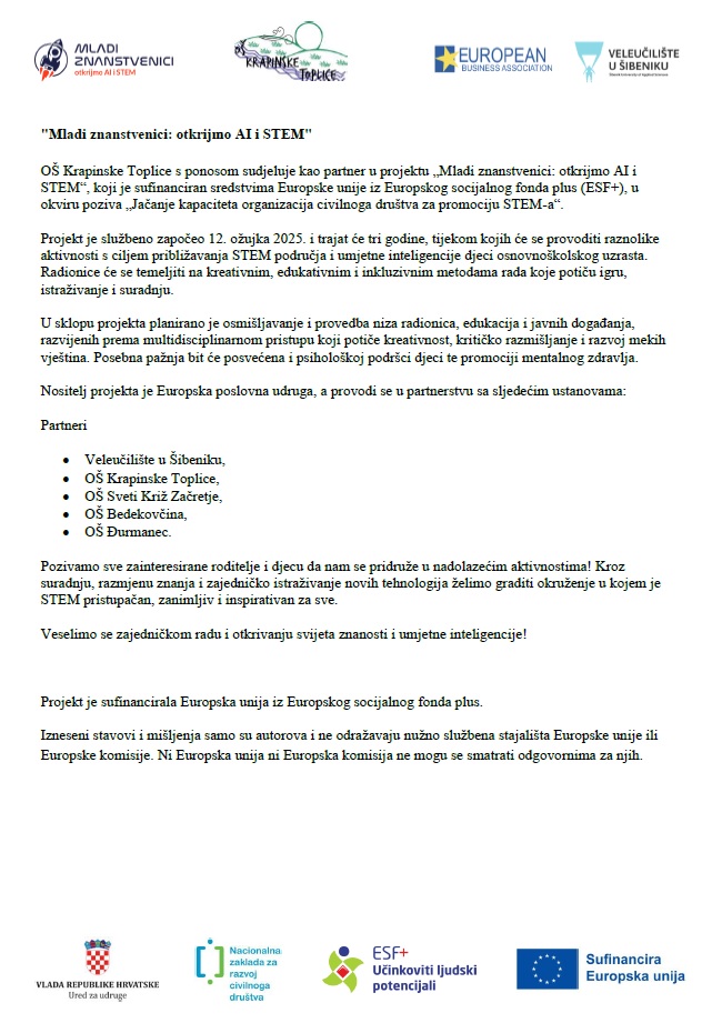 Radionice u sklopu projekta "Mladi znanstvenici: otkrijmo AI i STEM"