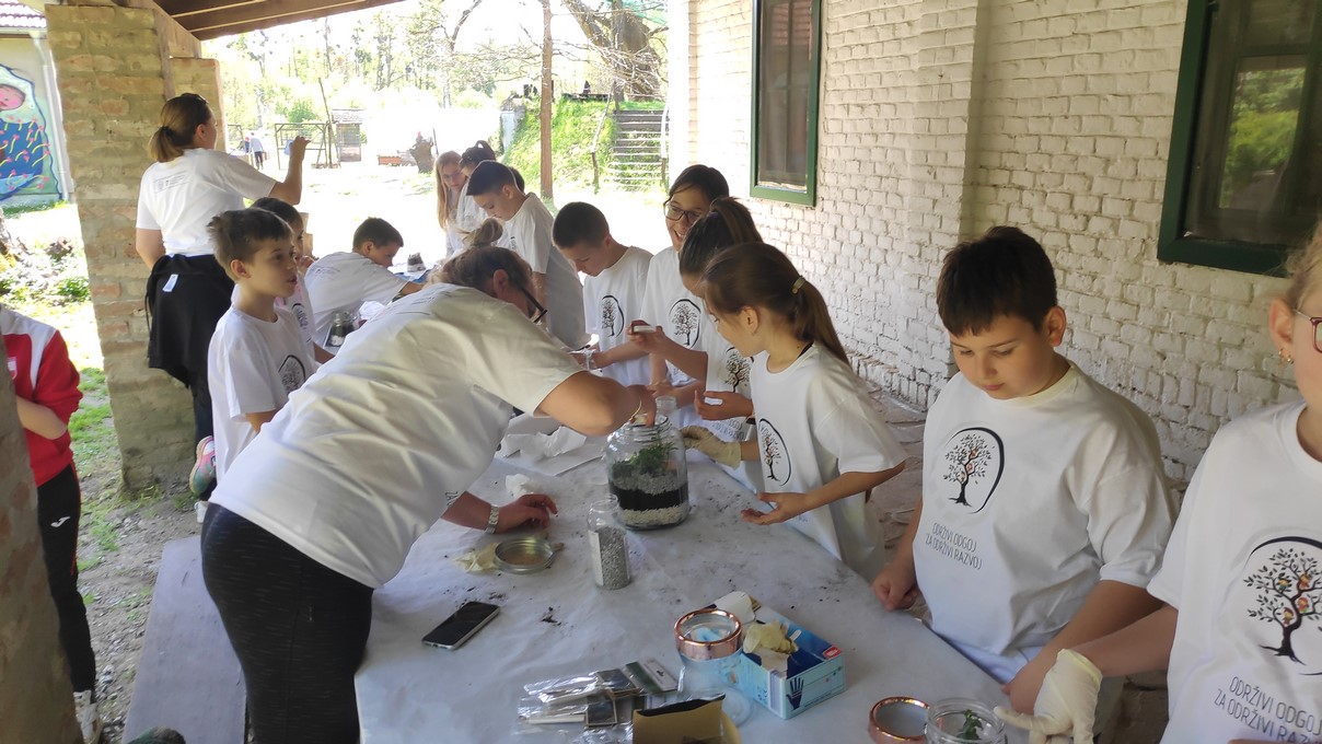 U skupinama smo izrađivali biljne terarije koji sada krase naše učionice, knjižnicu i zbornicu. Svaki učenik je dobio majicu i rokovnik, a u školu smo ponijeli i kante za odvajanje otpada koje smo postavili u holu kako bi potaknuli sve učenike naše škole na razvrstavanje otpada. Kante planiramo oslikati i na njih istaknuti eko poruke.
