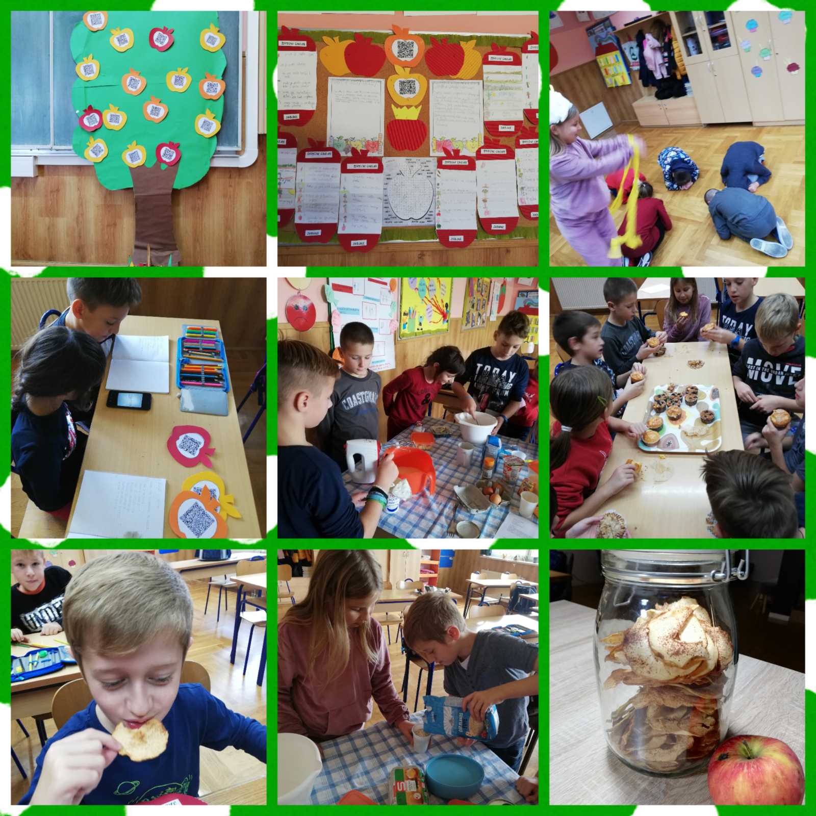 Dan jabuka, 20. listopada je također bio poseban dan posvećen ovoj kraljici voća. Učenici su cijeli dan imali aktivnosti s jabukama. Učili su o vrstama jabuka, čitali i glumili igrokaze u kojima je jabuka glavni lik, izrađivali postere o Danu jabuka u različitim digitalnim alatima, pjevali pjesme posvećene jabukama, proučavali običaje vezane uz jabuke, pisali recepte s jabukama, izvodili pokuse s jabukama, imali matematičke zadatke s jabukama, pisali poslovice o jabukama, proučavali životni ciklus jabuke i rješavali križaljke s temom voća. Motiv jabuke se našao i na listićima za predvježbe pisanja i rezanja. Na kraju su se učenici i posladili različitim proizvodima od jabuka: domaćim pekmezom, savijačom, pitom, čipsom od jabuka, ušećerenim jabukama, mufinnima, sokom i čajem od jabuka, kompotom od jabuka i voćnim ražnjićima.